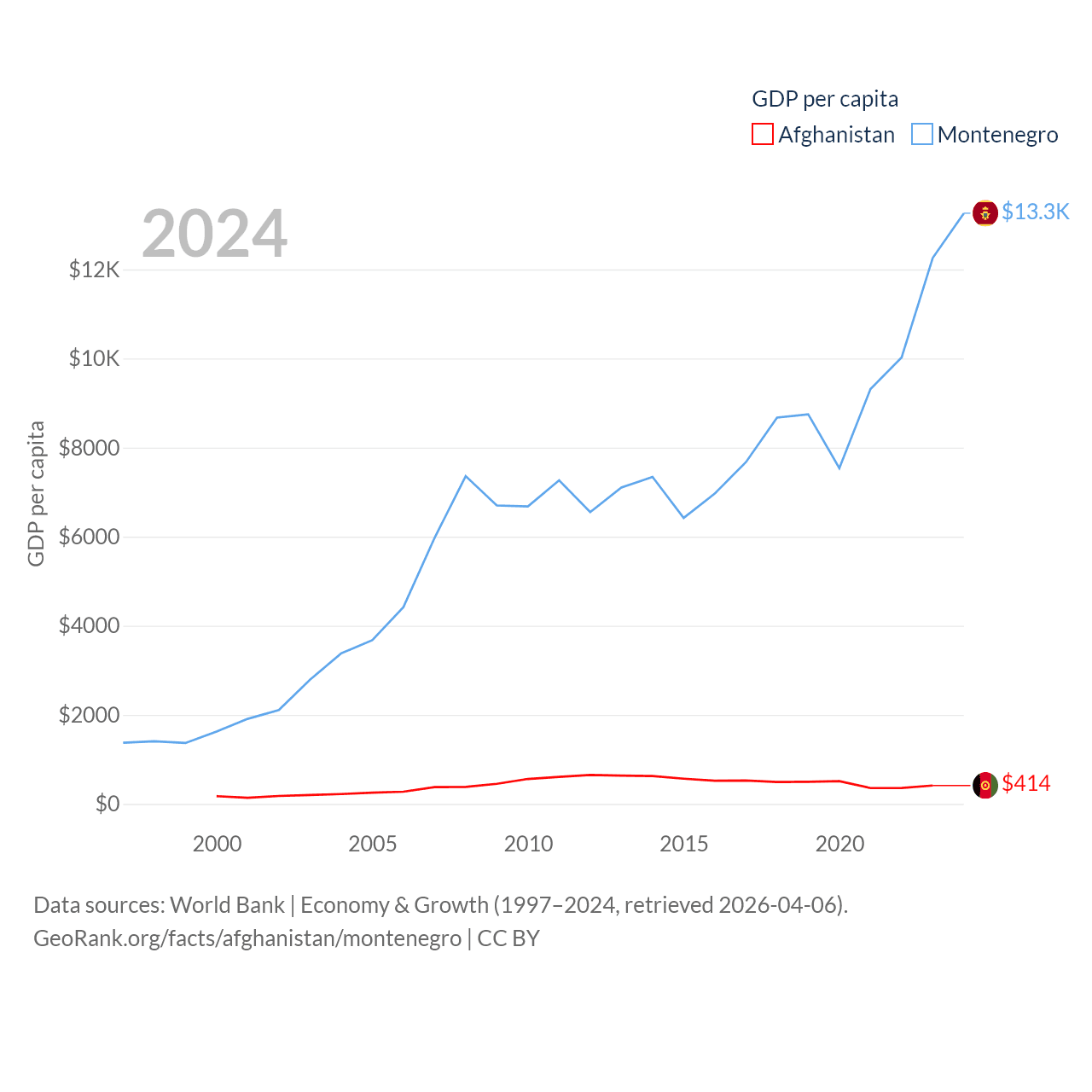 By GDP, Afghanistan ranks 137/197 ($17.2B) and Montenegro ranks 155/197 ($8.27B). By GDP per capita, Afghanistan ranks 196/197 ($414), while Montenegro ranks 77/197 ($13,263).