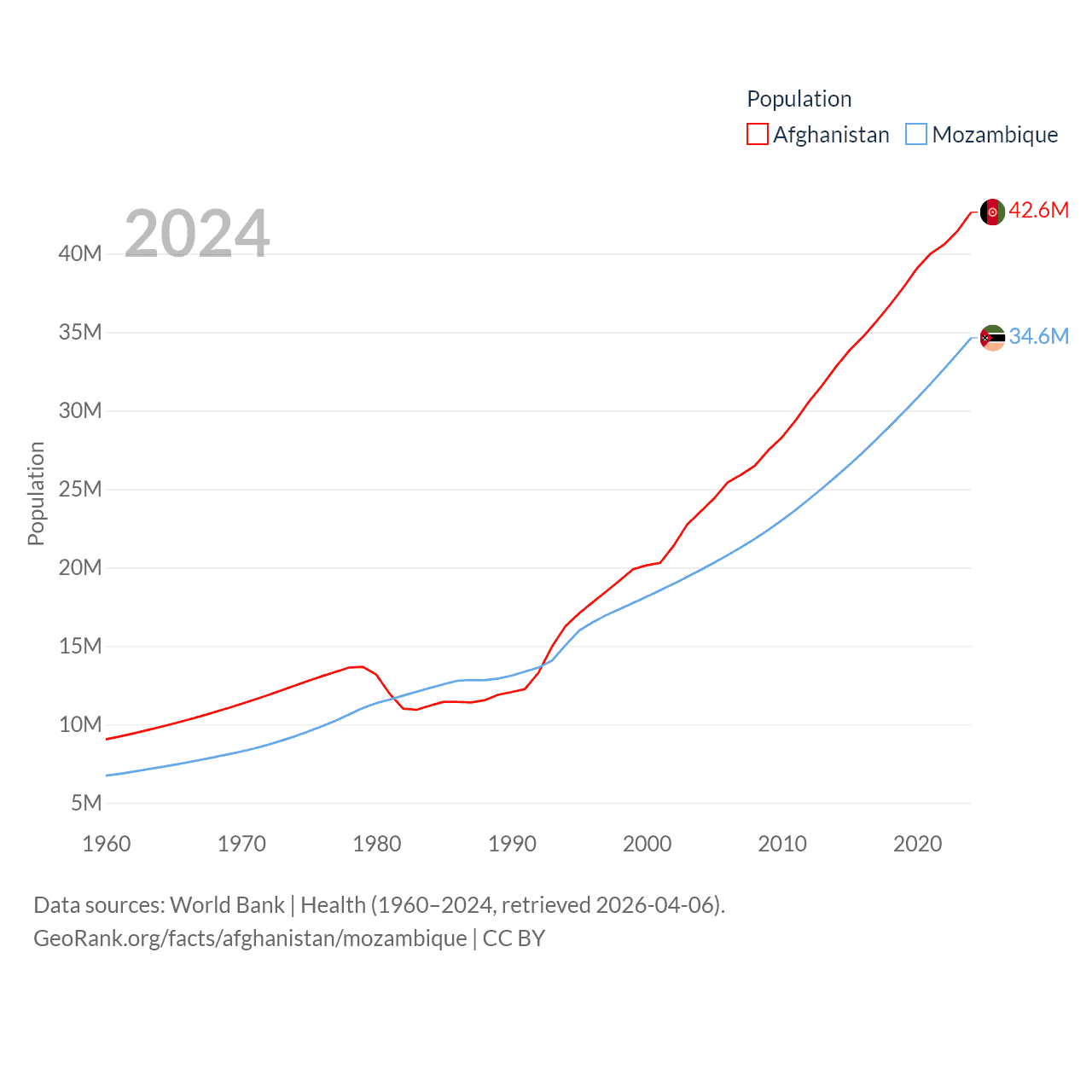 Afghanistan has a population of 42.6M (ranked 36/197), compared with 34.6M in Mozambique (ranked 46/197). Afghanistan's land area is 251,827 sq mi versus 303,623 sq mi for Mozambique (ranked 40th vs. 34th).