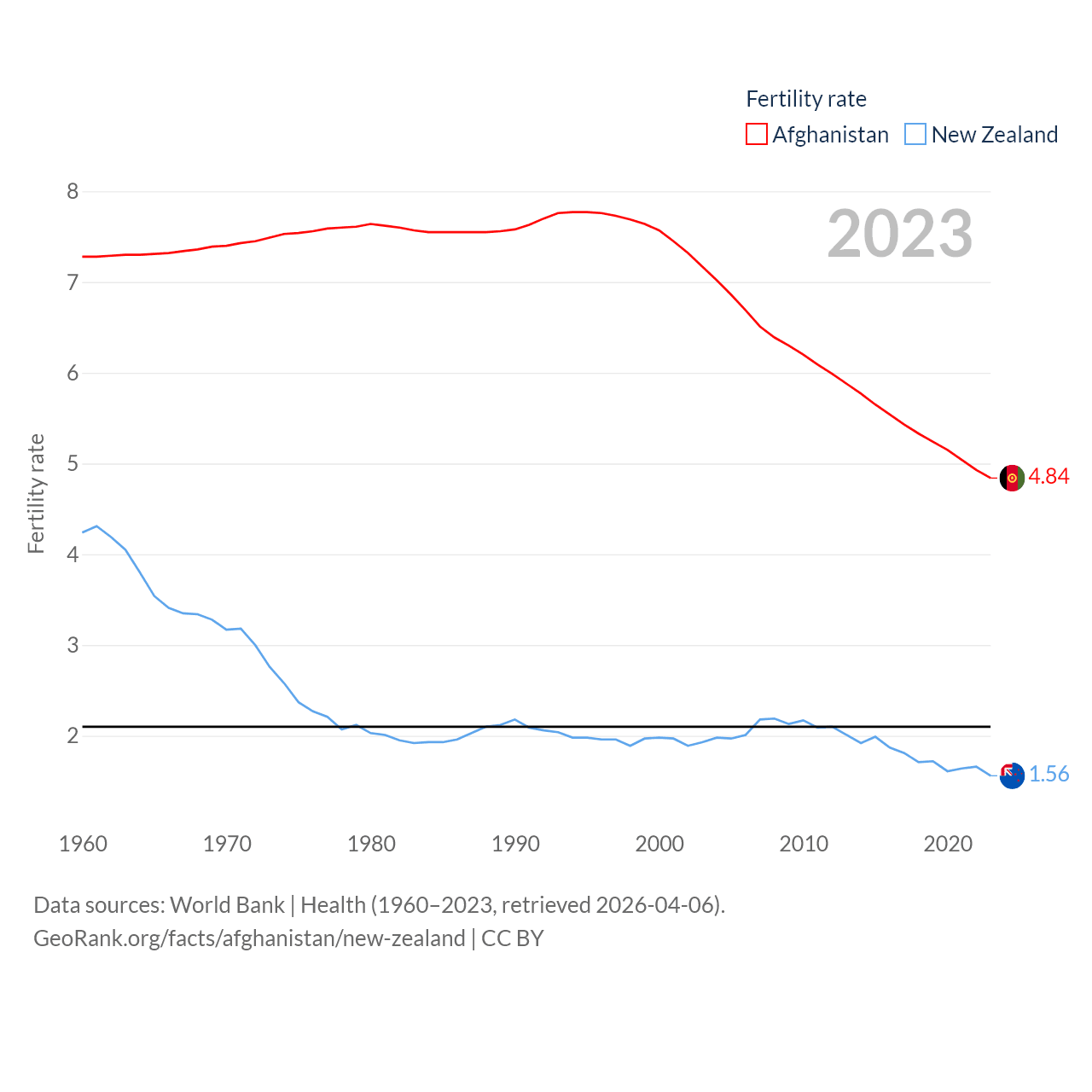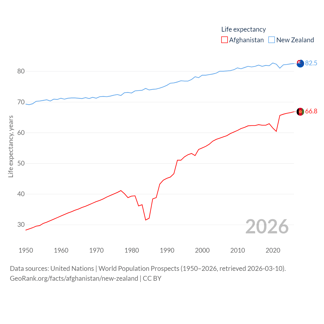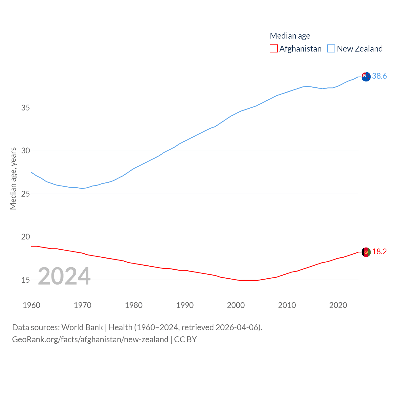 Afghanistan has a population of 42.6M (ranked 36/197), compared with 5.29M in New Zealand (ranked 123/197). Afghanistan's land area is 251,827 sq mi versus 101,665 sq mi for New Zealand (ranked 40th vs. 74th).