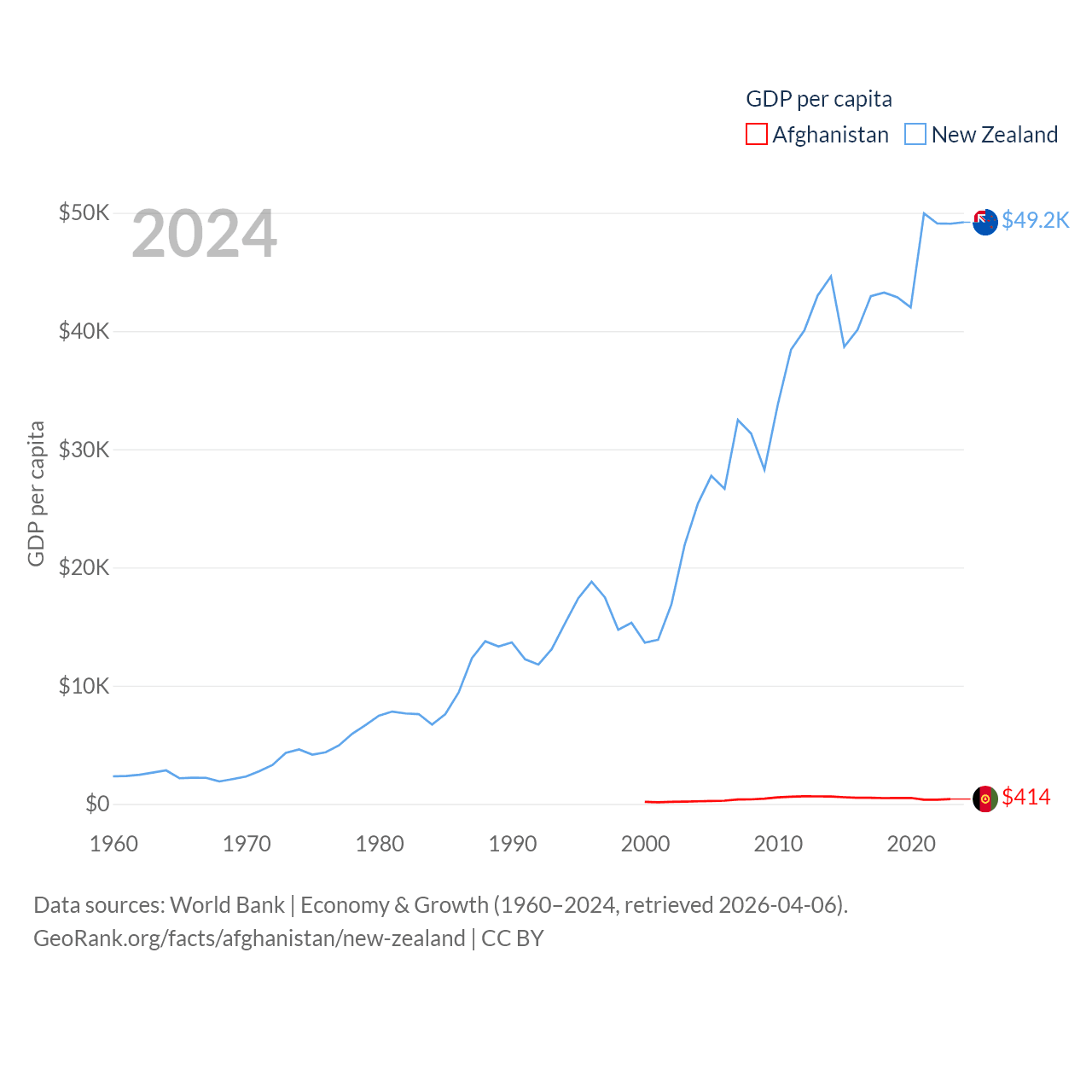 By GDP, Afghanistan ranks 137/197 ($17.2B) and New Zealand ranks 52/197 ($260B). By GDP per capita, Afghanistan ranks 196/197 ($414), while New Zealand ranks 26/197 ($49,205).