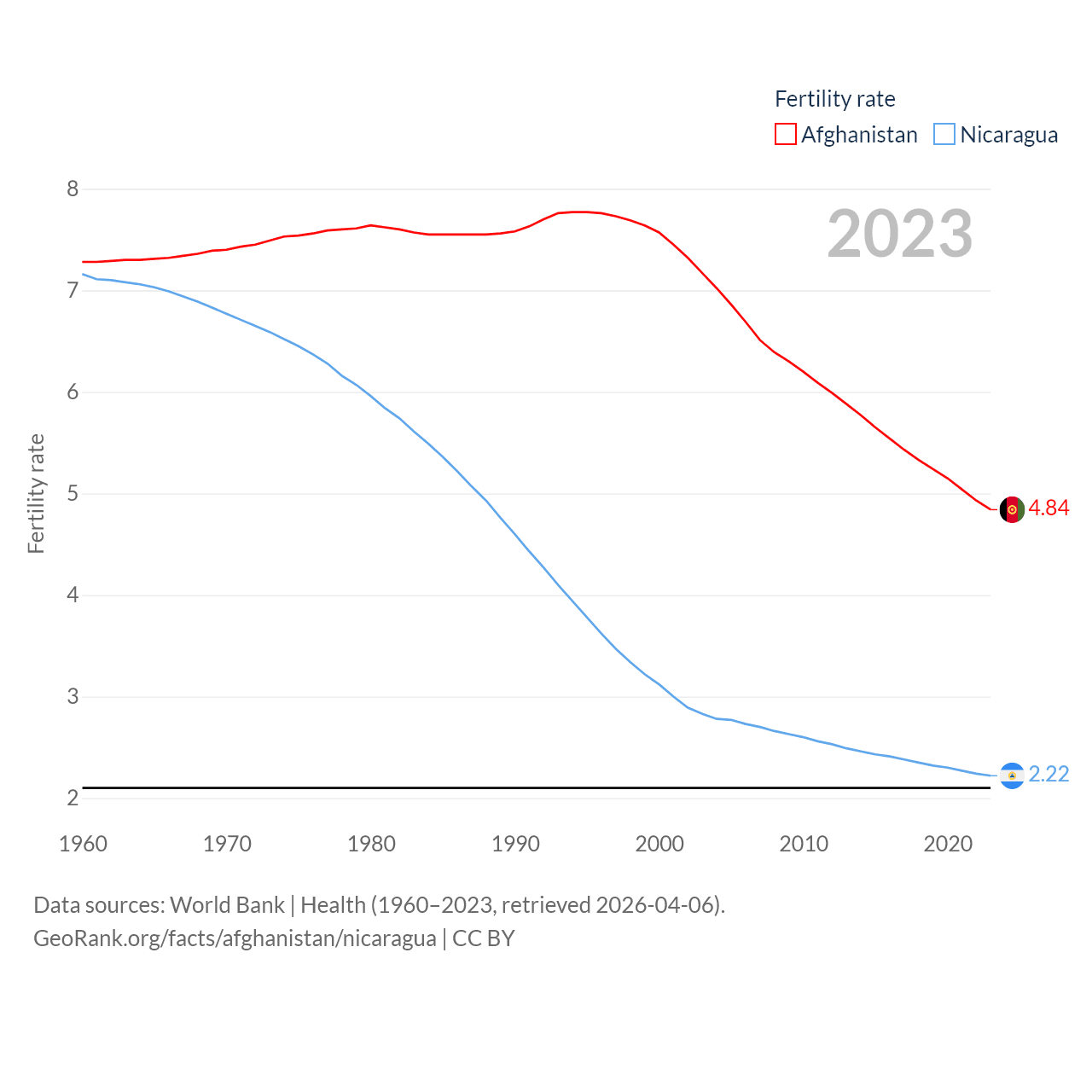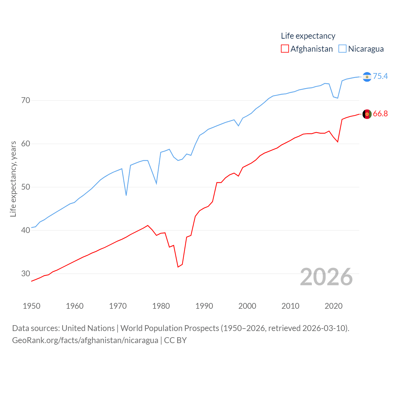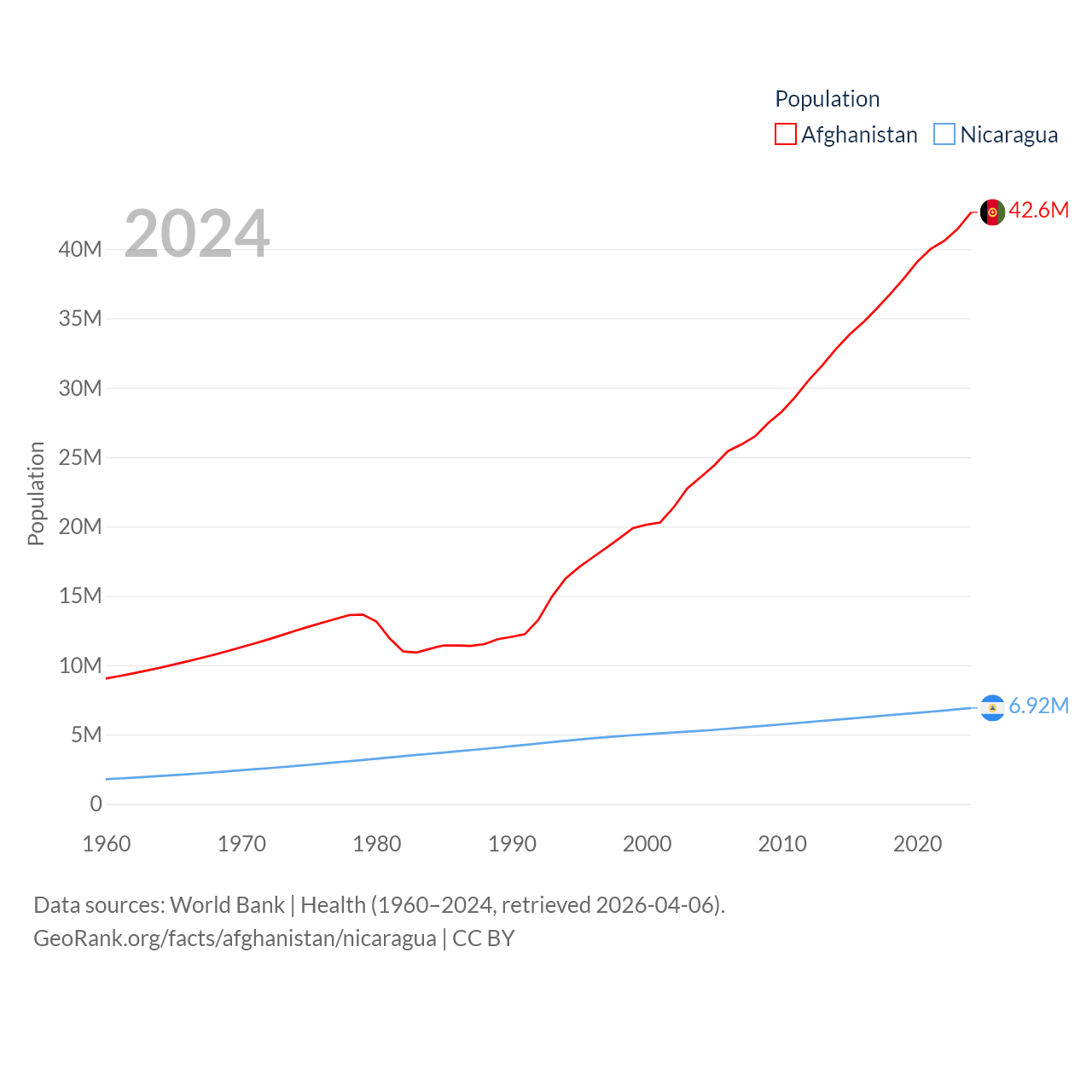 Afghanistan has a population of 42.6M (ranked 36/197), compared with 6.92M in Nicaragua (ranked 108/197). Afghanistan's land area is 251,827 sq mi versus 46,464 sq mi for Nicaragua (ranked 40th vs. 98th).