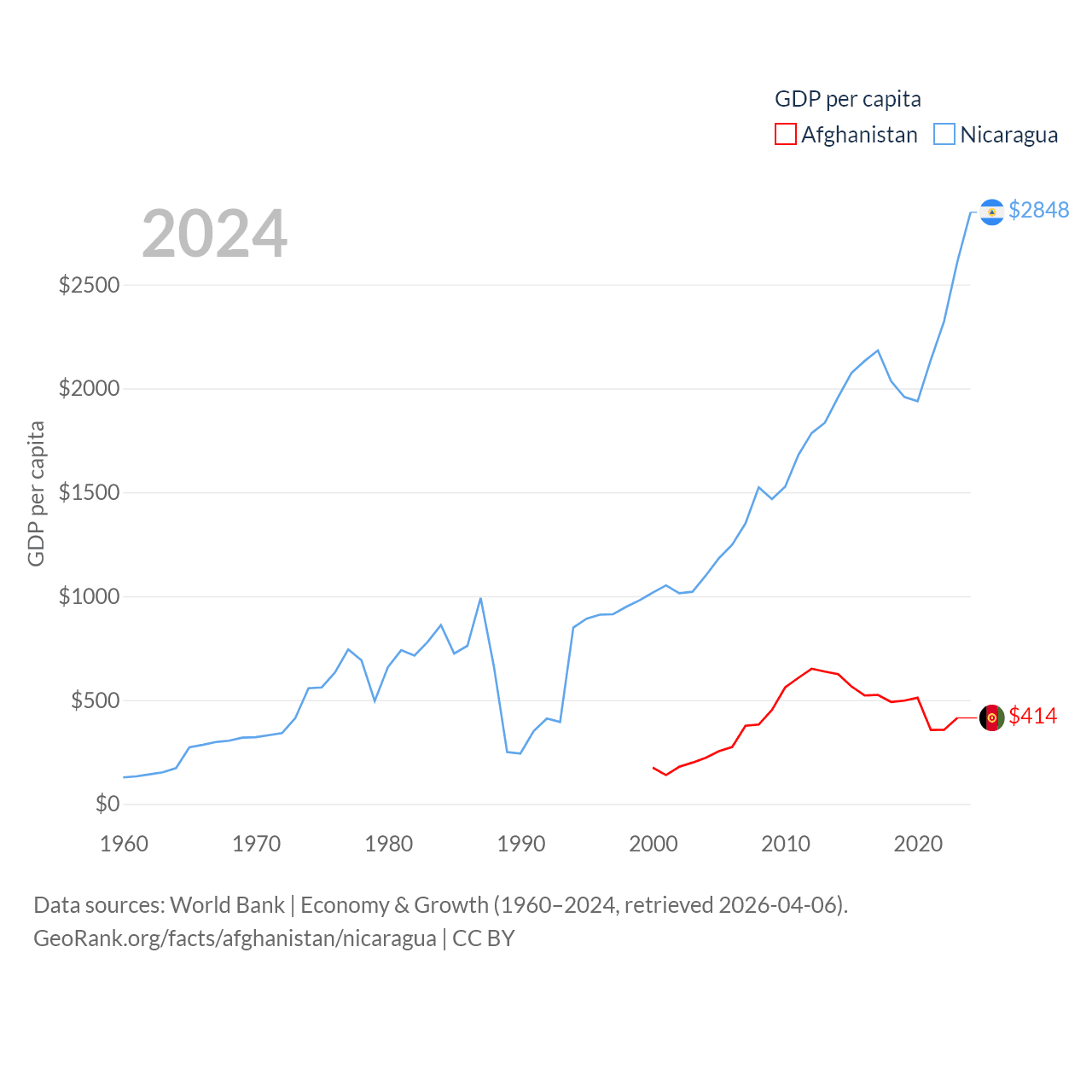 By GDP, Afghanistan ranks 137/197 ($17.2B) and Nicaragua ranks 131/197 ($19.7B). By GDP per capita, Afghanistan ranks 196/197 ($414), while Nicaragua ranks 141/197 ($2,848).