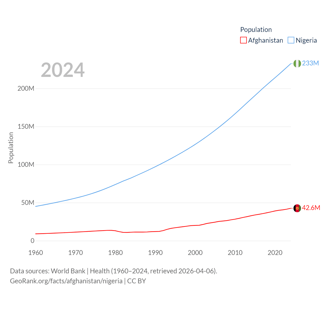 Afghanistan has a population of 42.6M (ranked 36/197), compared with 233M in Nigeria (ranked 6/197). Afghanistan's land area is 251,827 sq mi versus 351,650 sq mi for Nigeria (ranked 40th vs. 30th).