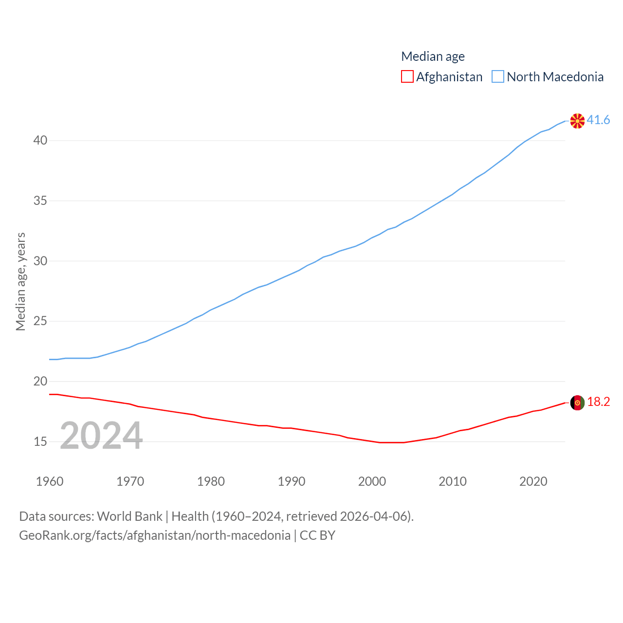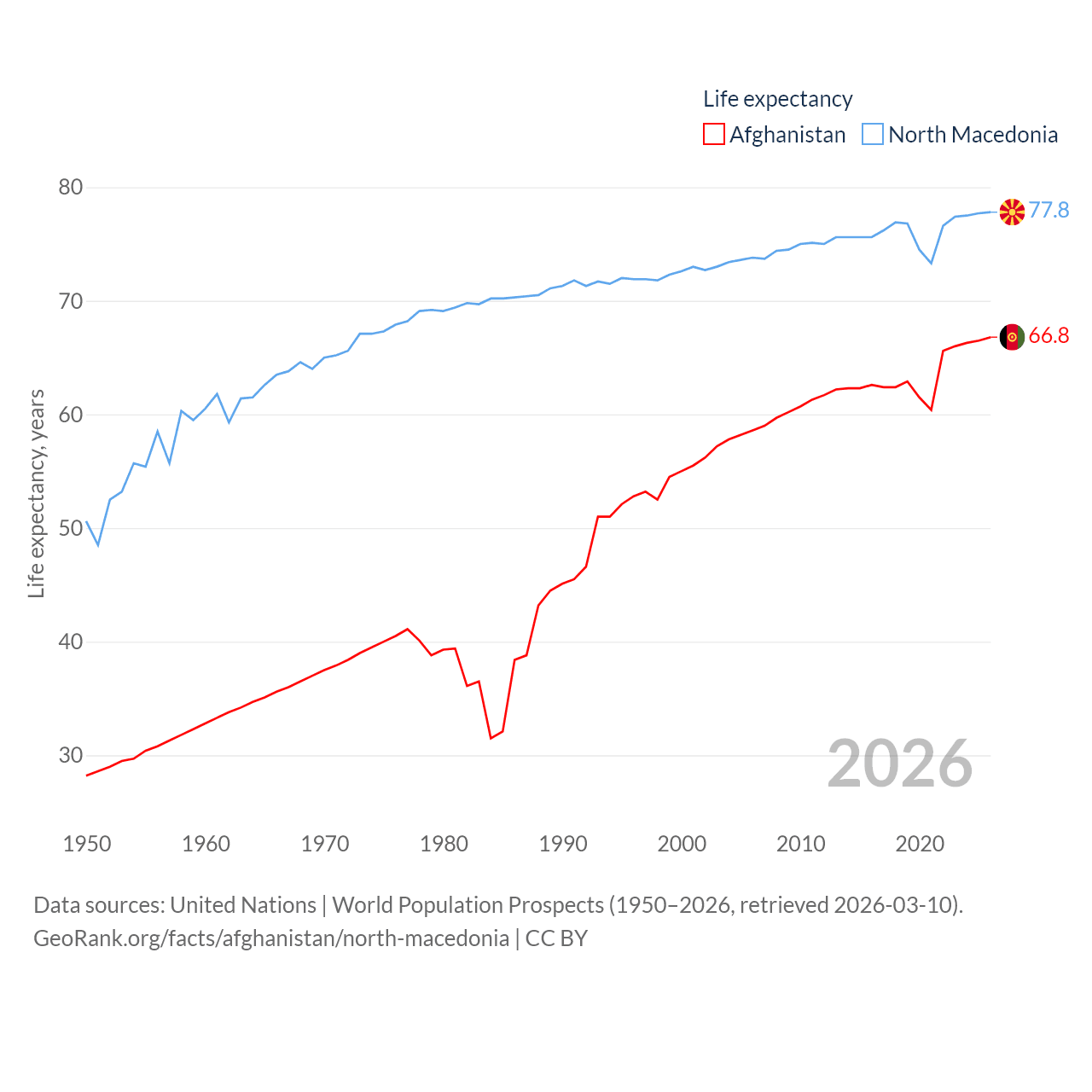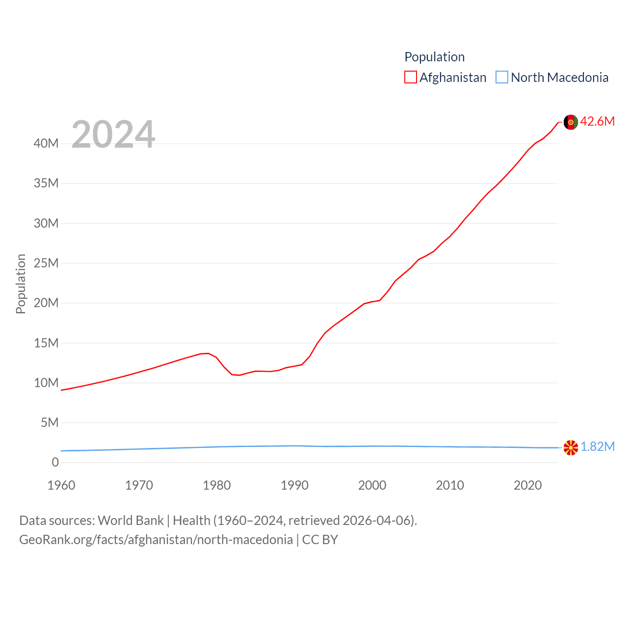 Afghanistan has a population of 42.6M (ranked 36/197), compared with 1.82M in North Macedonia (ranked 150/197). Afghanistan's land area is 251,827 sq mi versus 9,737 sq mi for North Macedonia (ranked 40th vs. 145th).