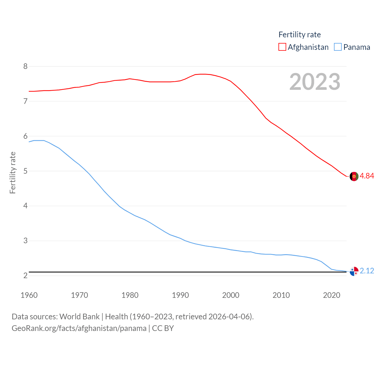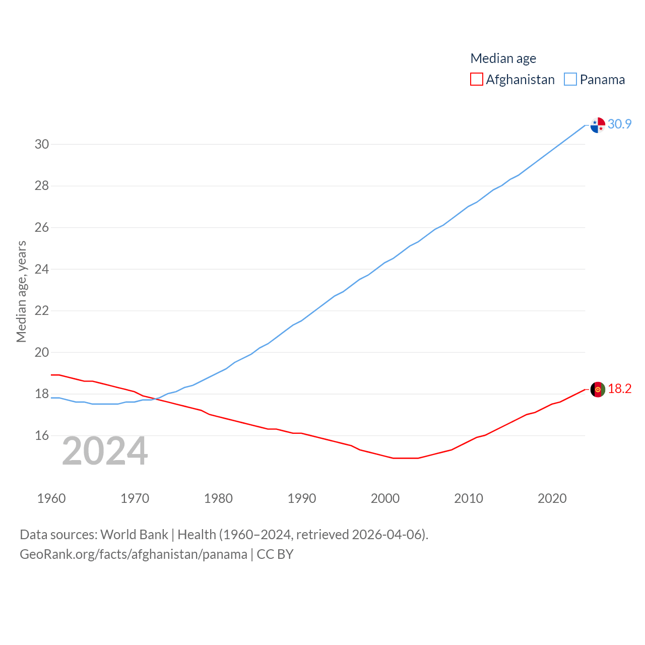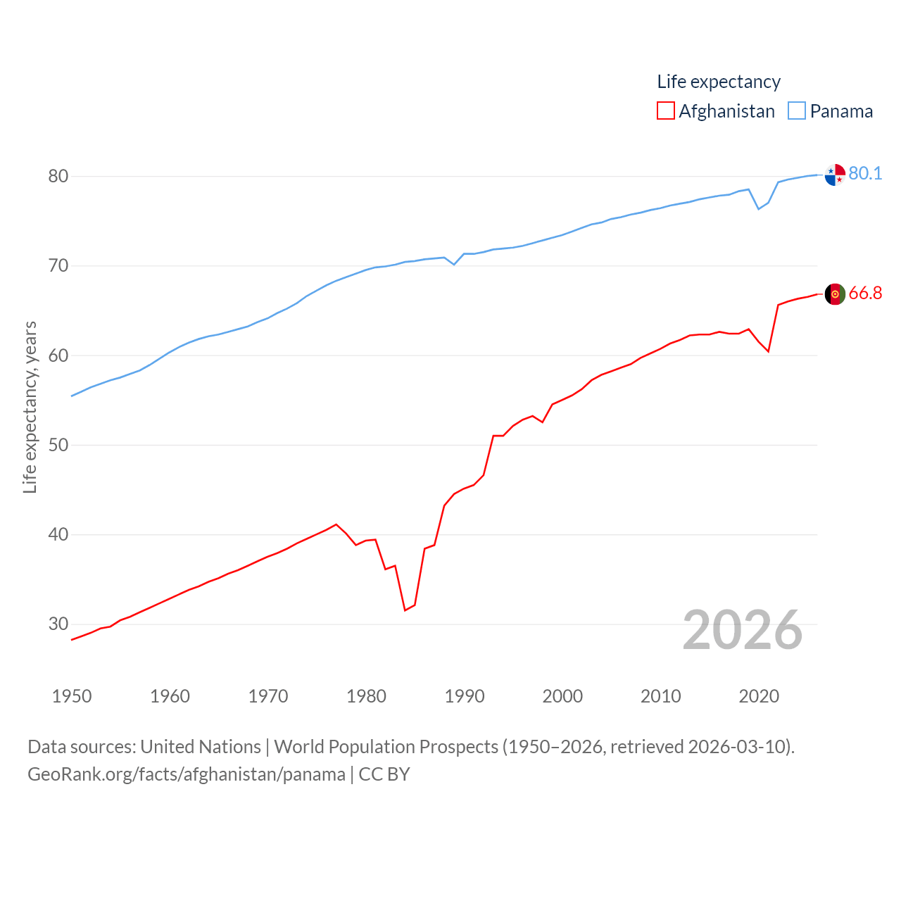 Afghanistan has a population of 42.6M (ranked 36/197), compared with 4.52M in Panama (ranked 128/197). Afghanistan's land area is 251,827 sq mi versus 28,641 sq mi for Panama (ranked 40th vs. 115th).