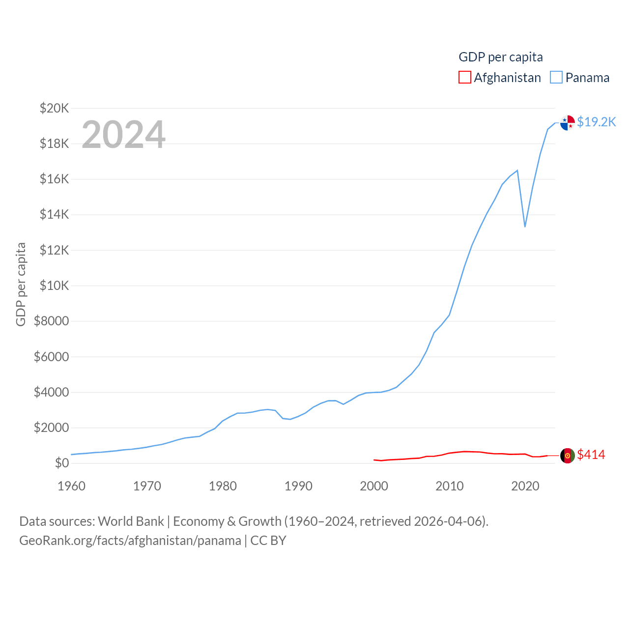 By GDP, Afghanistan ranks 137/197 ($17.2B) and Panama ranks 78/197 ($86.5B). By GDP per capita, Afghanistan ranks 196/197 ($414), while Panama ranks 60/197 ($19,161).
