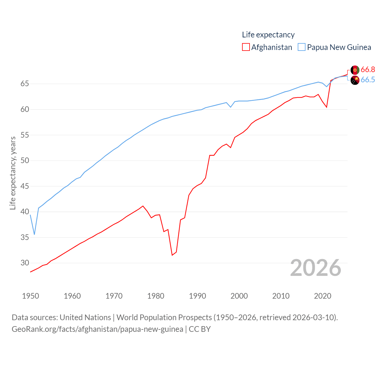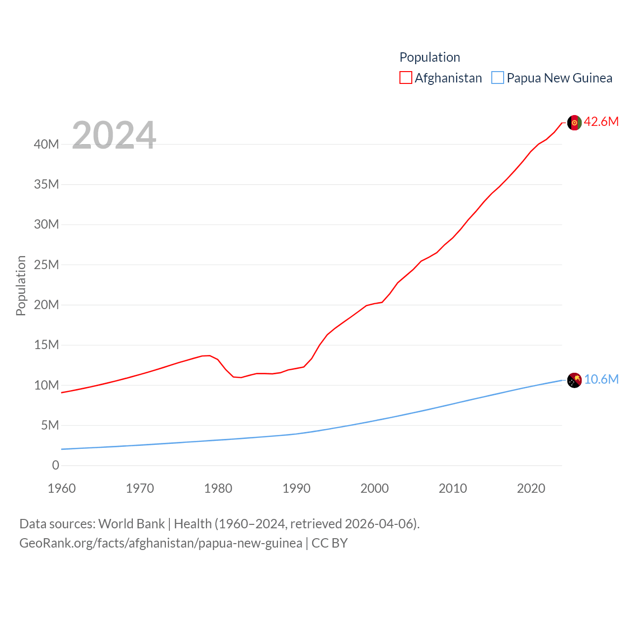 Afghanistan has a population of 42.6M (ranked 36/197), compared with 10.6M in Papua New Guinea (ranked 92/197). Afghanistan's land area is 251,827 sq mi versus 174,850 sq mi for Papua New Guinea (ranked 40th vs. 54th).