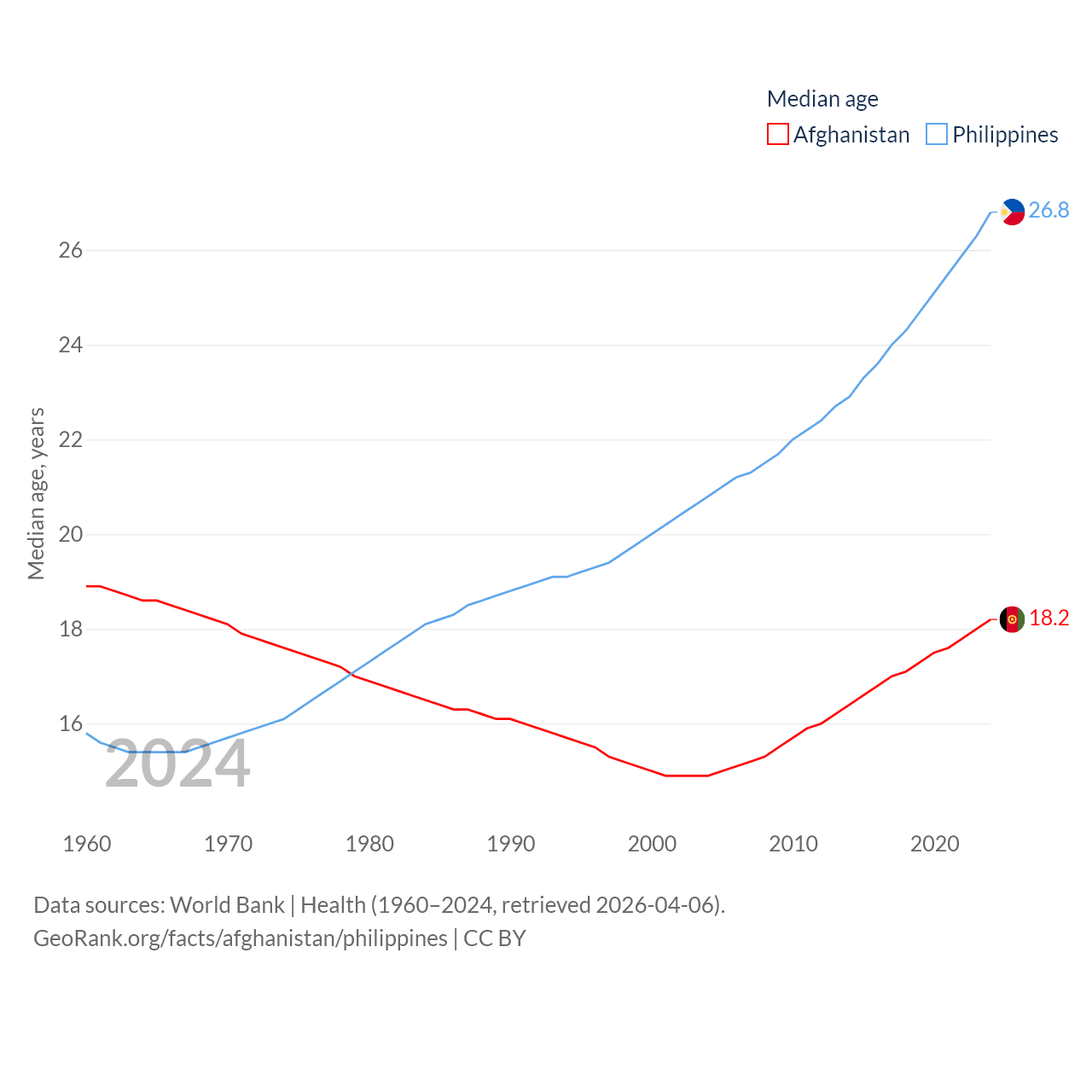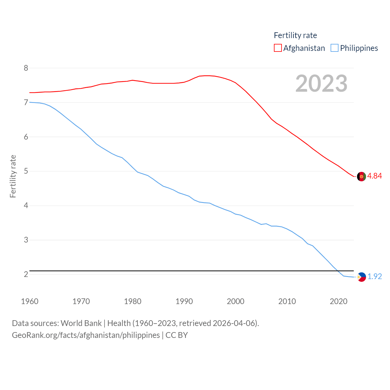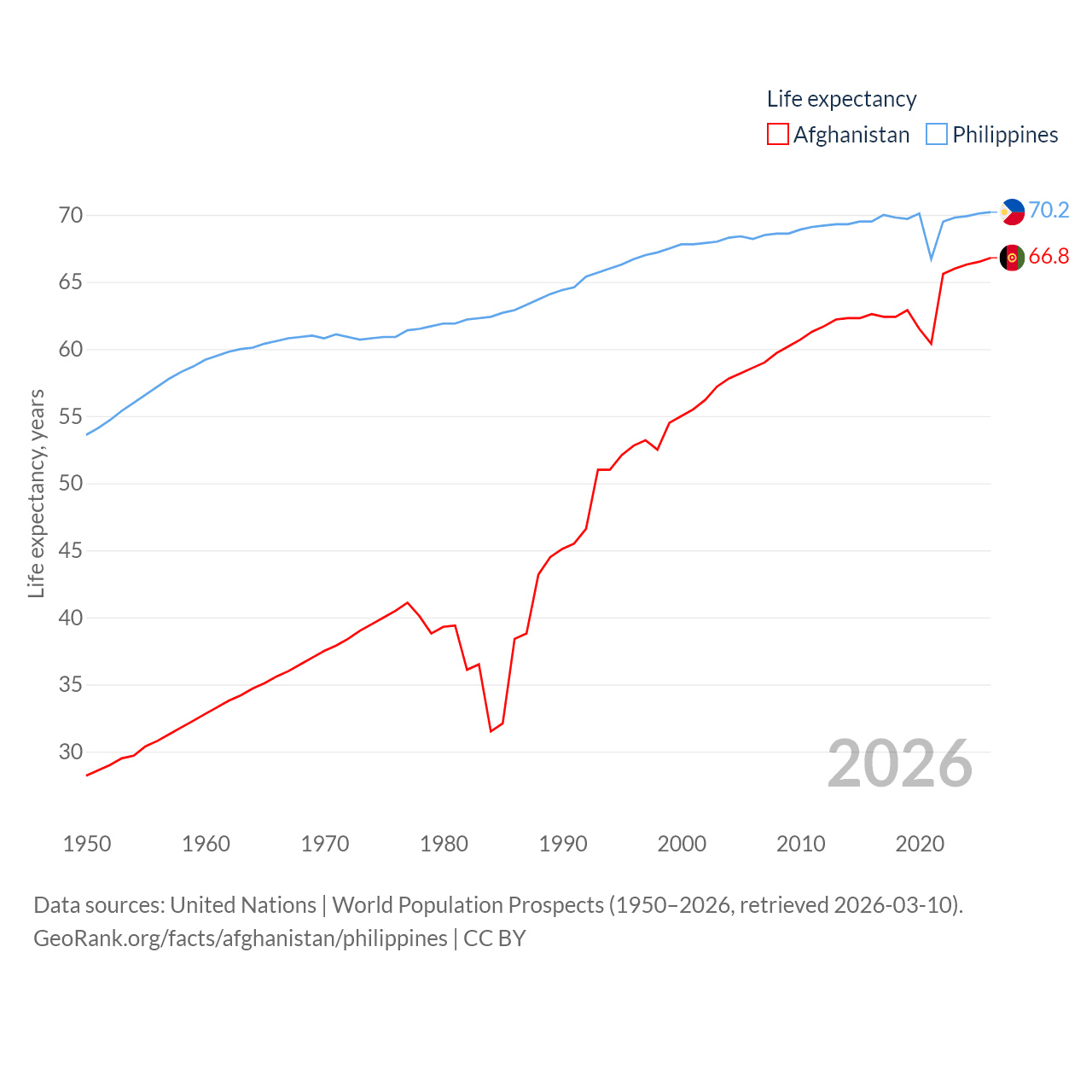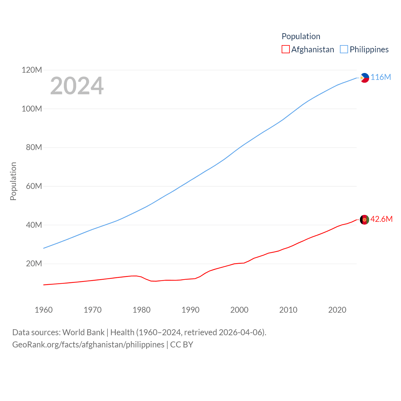 Afghanistan has a population of 42.6M (ranked 36/197), compared with 116M in The Philippines (ranked 14/197). Afghanistan's land area is 251,827 sq mi versus 115,124 sq mi for The Philippines (ranked 40th vs. 71st).