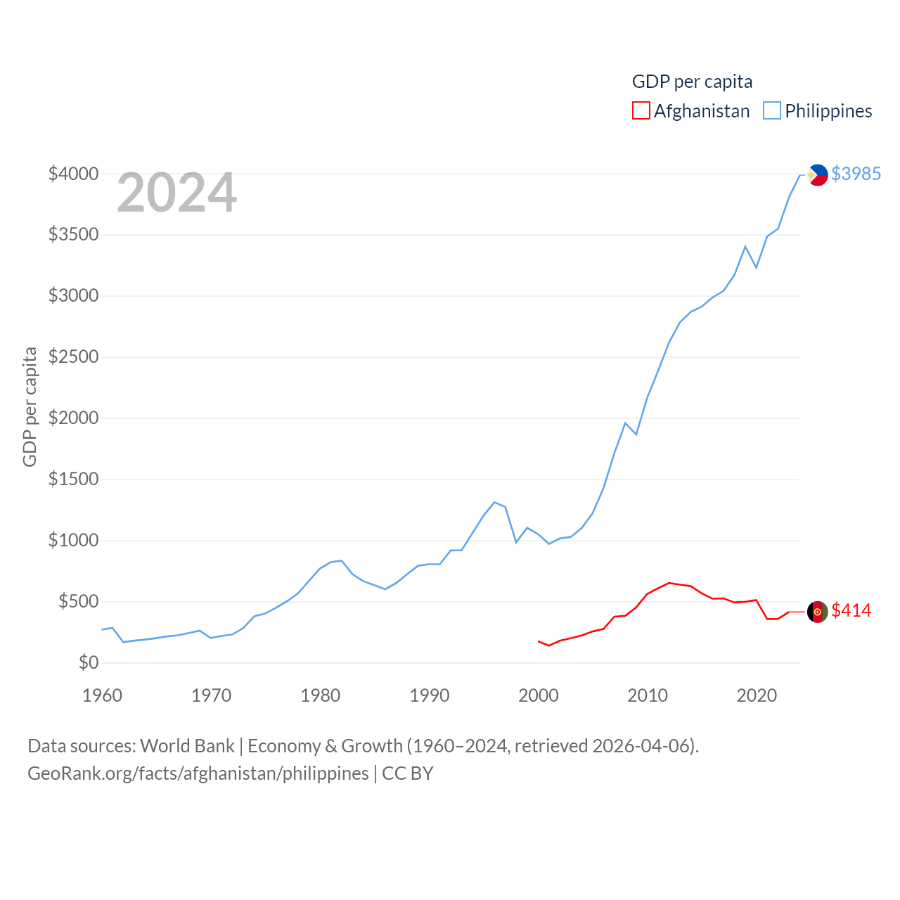 By GDP, Afghanistan ranks 137/197 ($17.2B) and The Philippines ranks 35/197 ($462B). By GDP per capita, Afghanistan ranks 196/197 ($414), while The Philippines ranks 130/197 ($3,985).