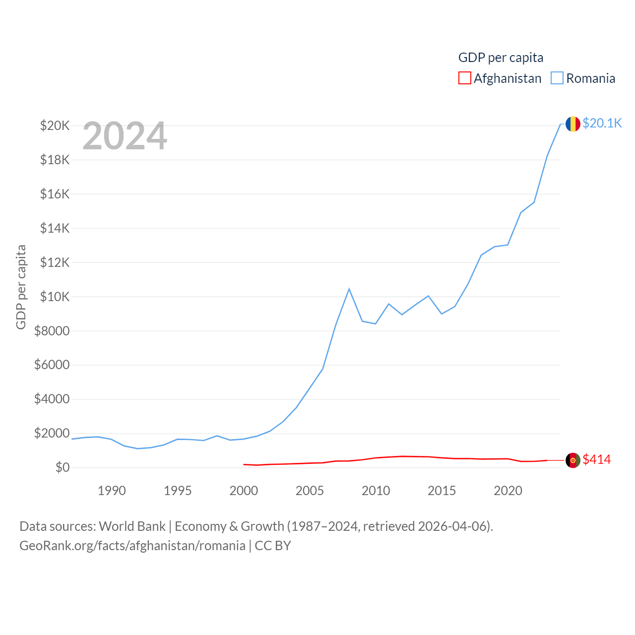 By GDP, Afghanistan ranks 137/197 ($17.2B) and Romania ranks 42/197 ($383B). By GDP per capita, Afghanistan ranks 196/197 ($414), while Romania ranks 58/197 ($20,080).