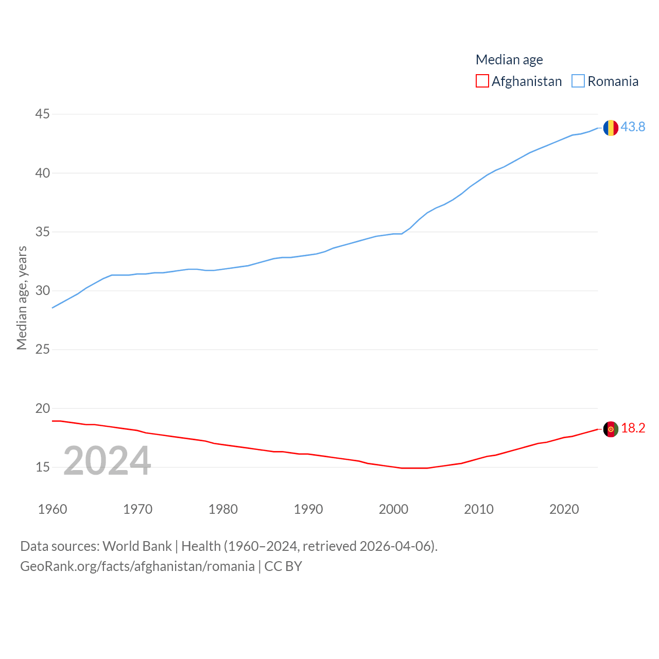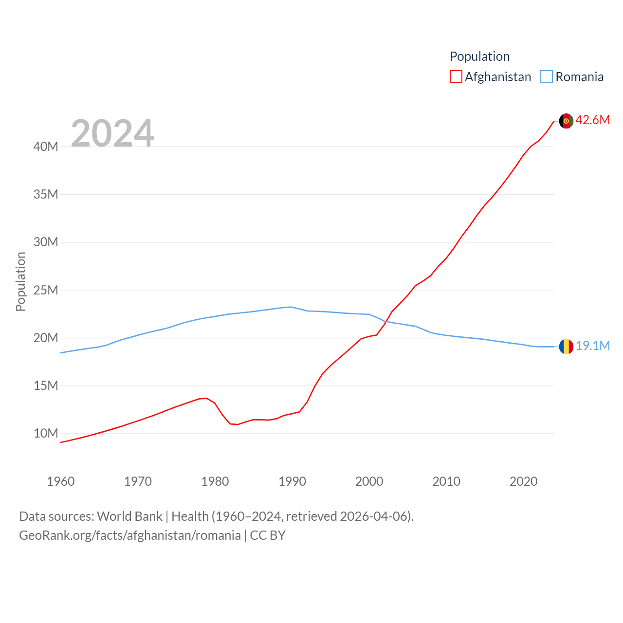 Afghanistan has a population of 42.6M (ranked 36/197), compared with 19.1M in Romania (ranked 67/197). Afghanistan's land area is 251,827 sq mi versus 88,834 sq mi for Romania (ranked 40th vs. 80th).