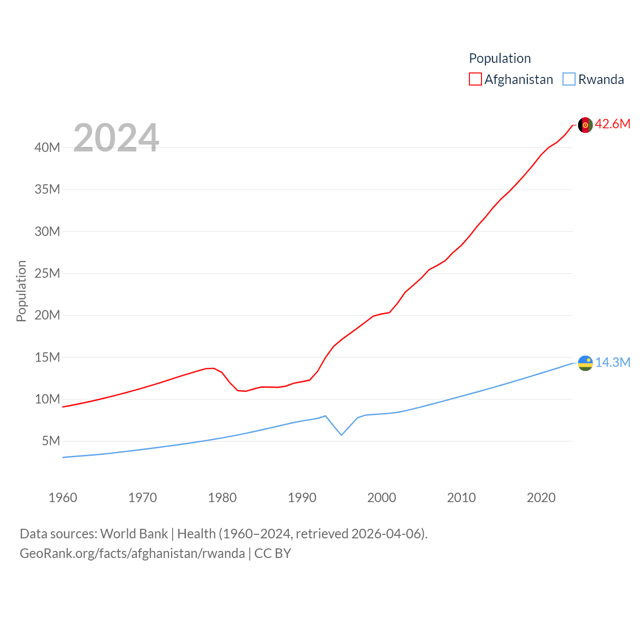 Afghanistan has a population of 42.6M (ranked 36/197), compared with 14.3M in Rwanda (ranked 77/197). Afghanistan's land area is 251,827 sq mi versus 9,525 sq mi for Rwanda (ranked 40th vs. 146th).