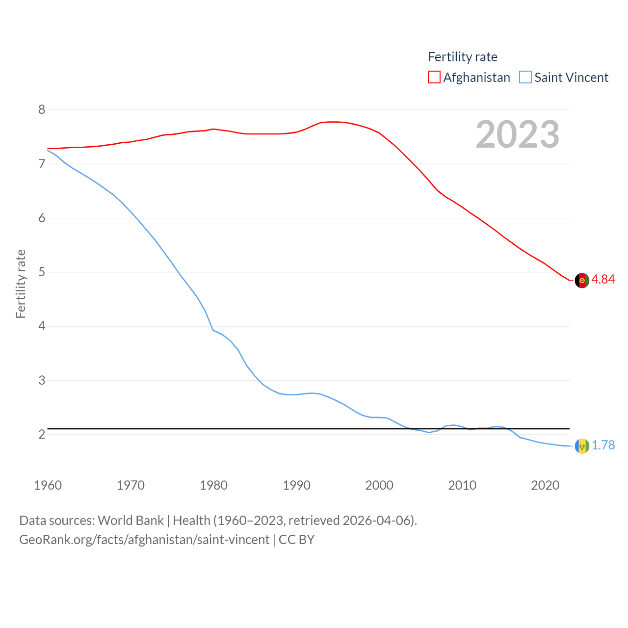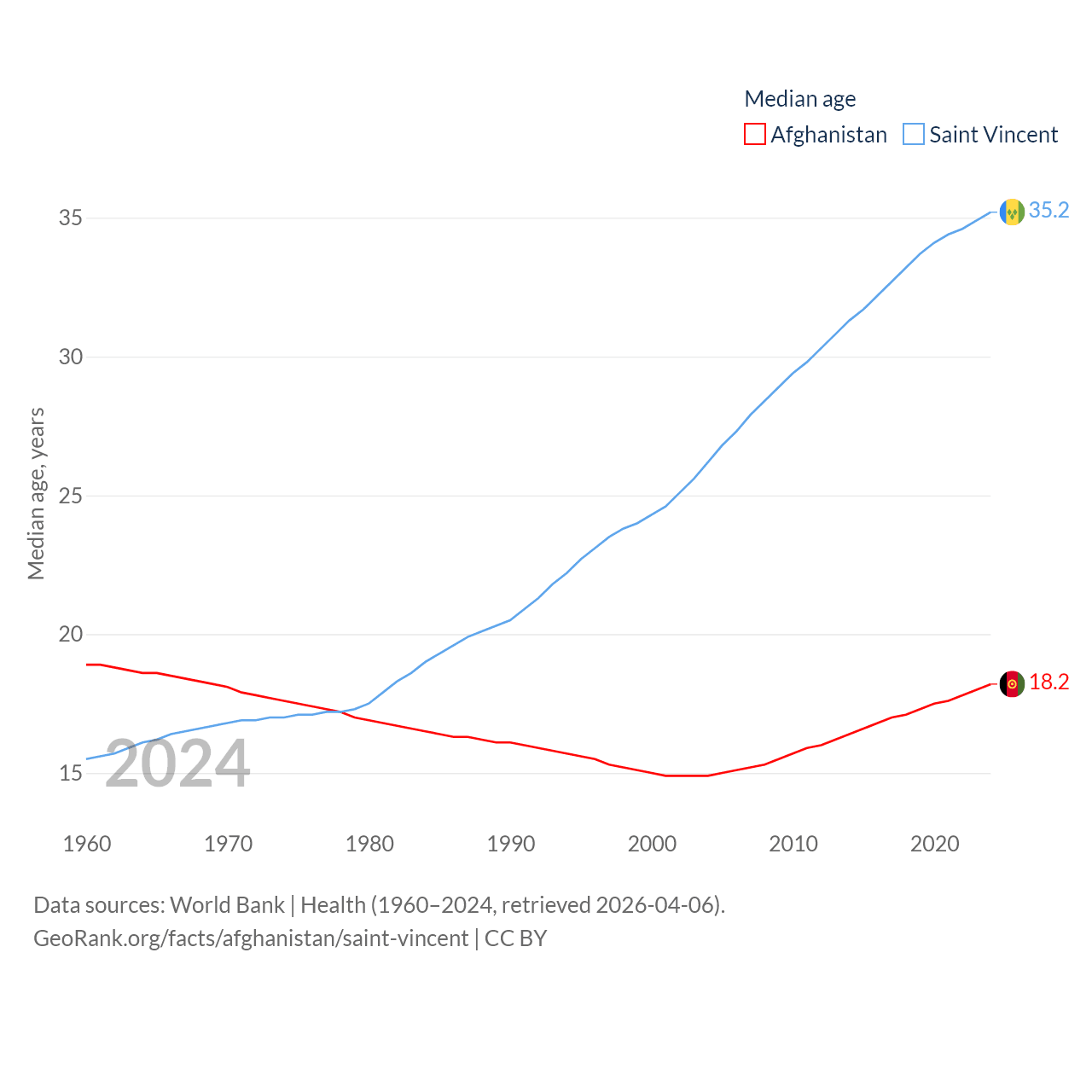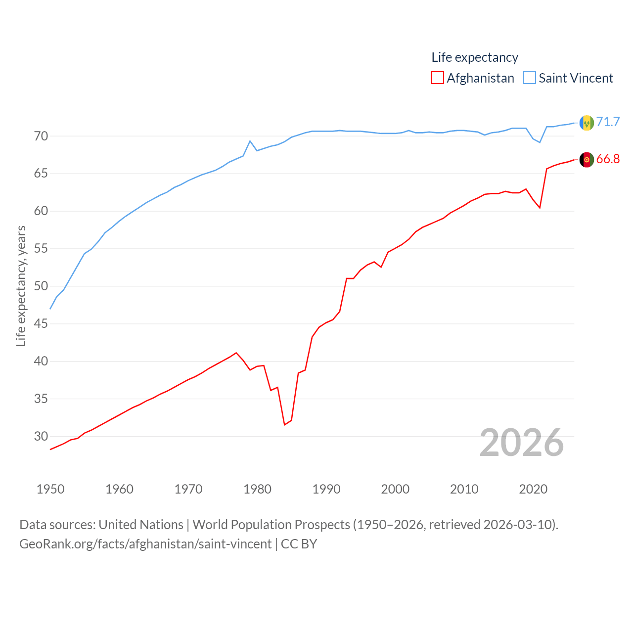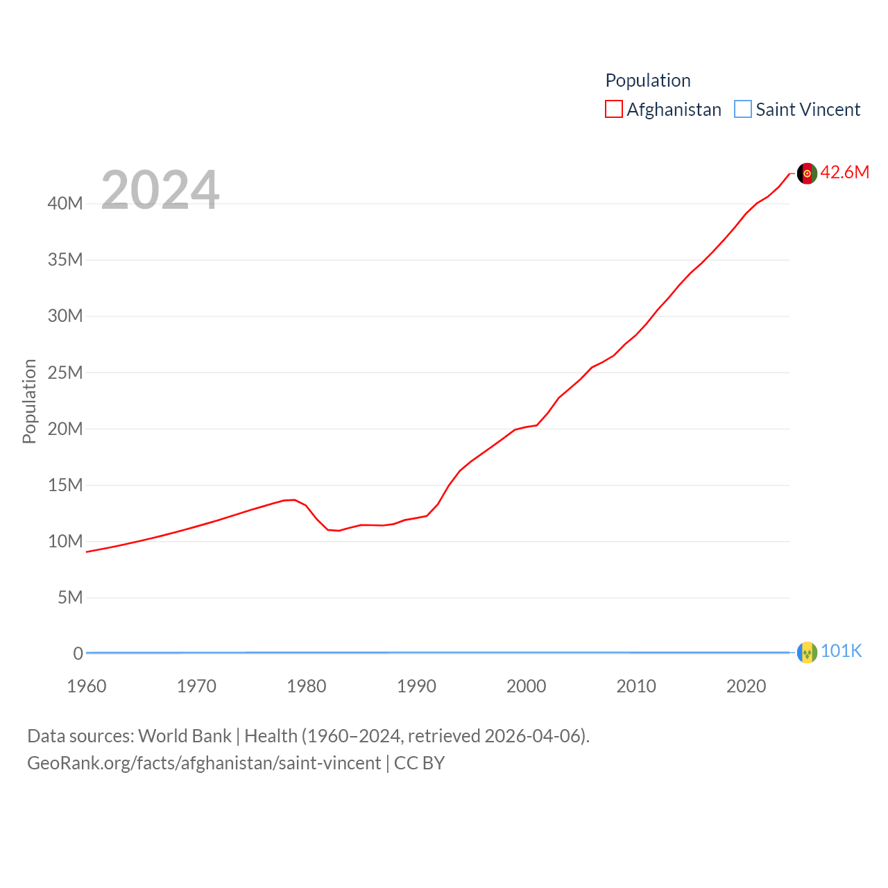Afghanistan has a population of 42.6M (ranked 36/197), compared with 101K in Saint Vincent (ranked 184/197). Afghanistan's land area is 251,827 sq mi versus 150.6 sq mi for Saint Vincent (ranked 40th vs. 185th).