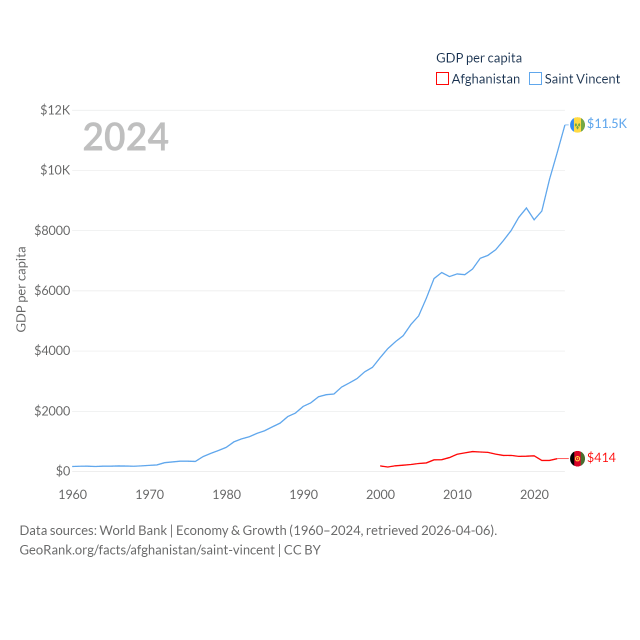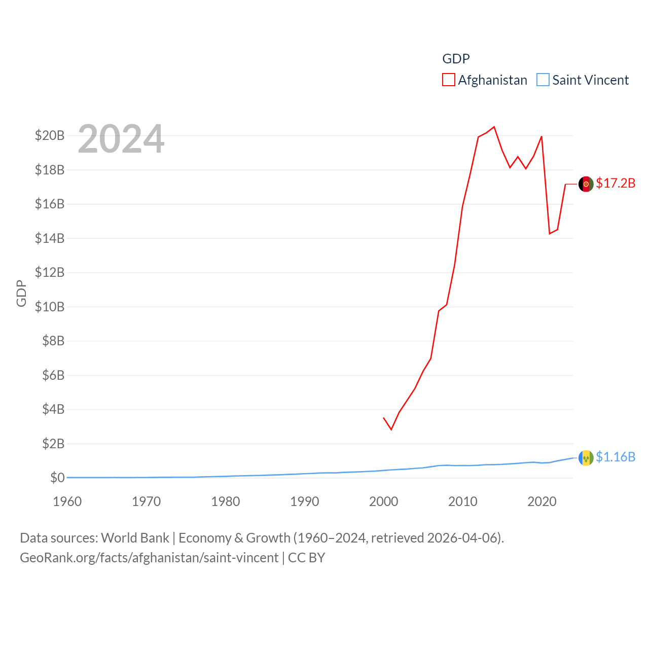 By GDP, Afghanistan ranks 137/197 ($17.2B) and Saint Vincent ranks 186/197 ($1.16B). By GDP per capita, Afghanistan ranks 196/197 ($414), while Saint Vincent ranks 81/197 ($11,501).