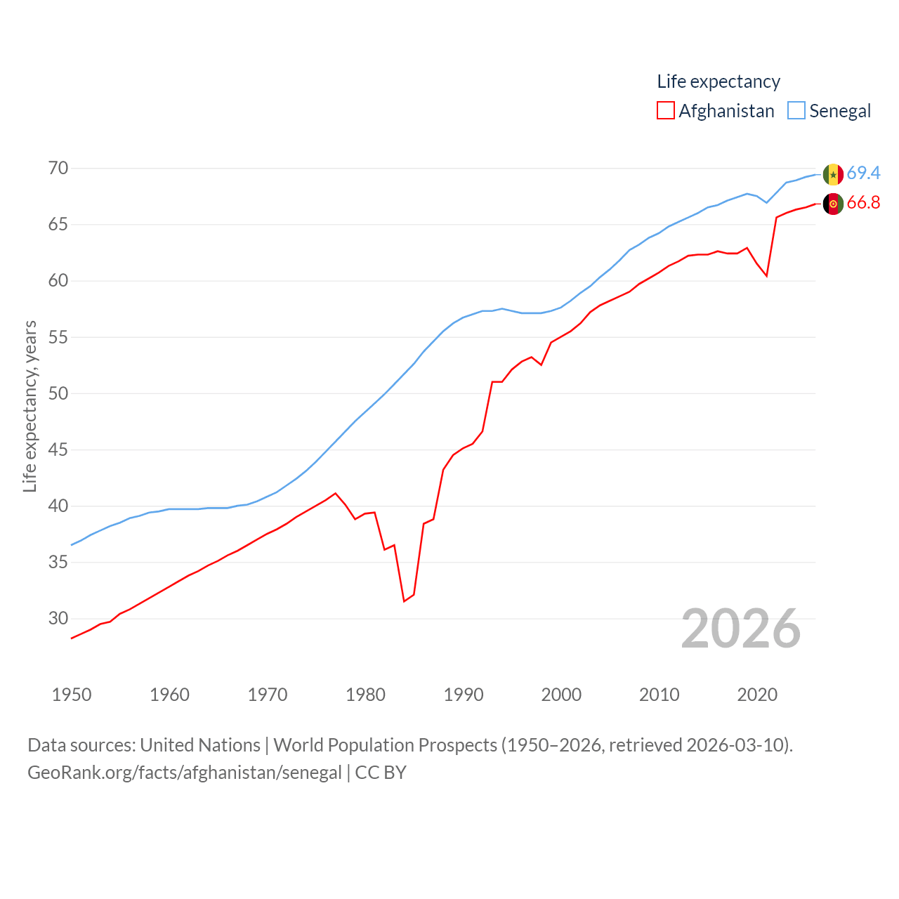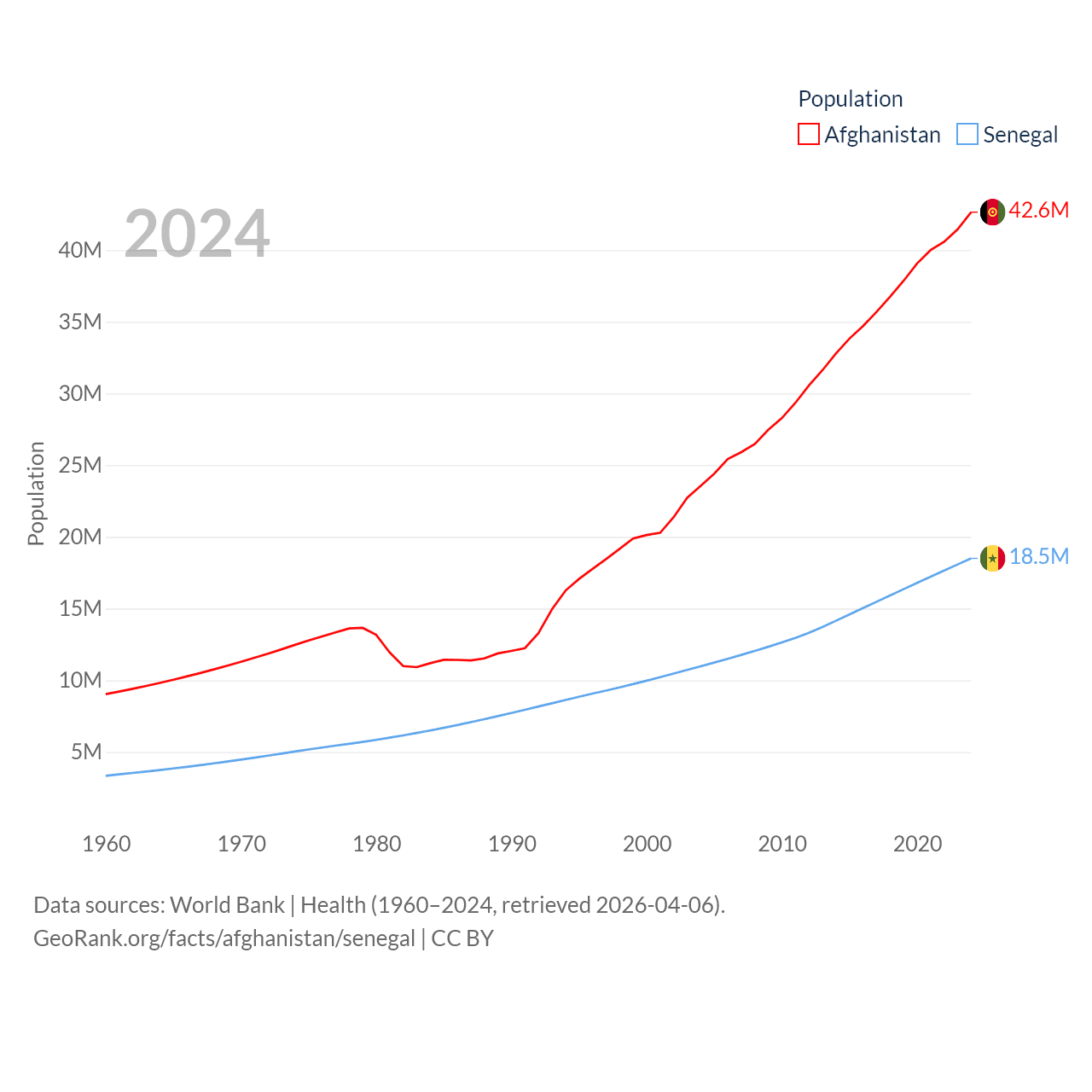 Afghanistan has a population of 42.6M (ranked 36/197), compared with 18.5M in Senegal (ranked 69/197). Afghanistan's land area is 251,827 sq mi versus 74,336 sq mi for Senegal (ranked 40th vs. 85th).