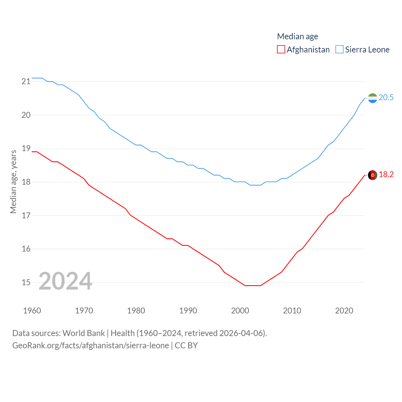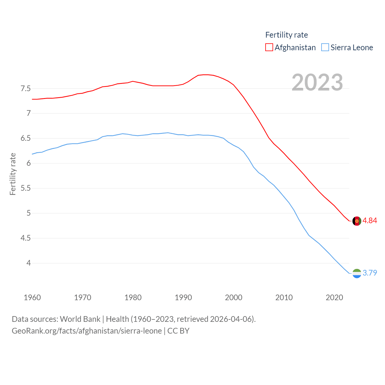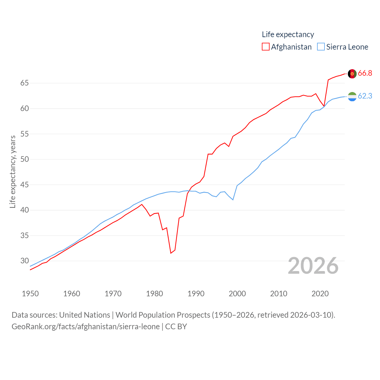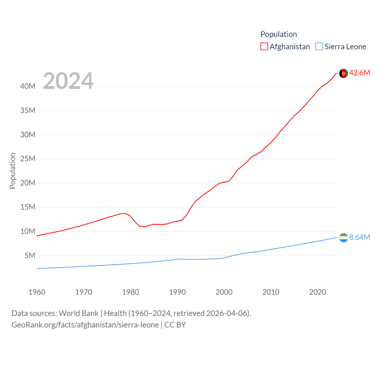 Afghanistan has a population of 42.6M (ranked 36/197), compared with 8.64M in Sierra Leone (ranked 102/197). Afghanistan's land area is 251,827 sq mi versus 27,869 sq mi for Sierra Leone (ranked 40th vs. 116th).