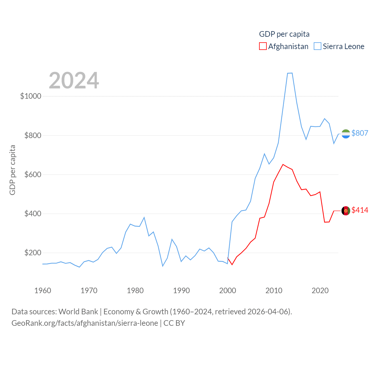 By GDP, Afghanistan ranks 137/197 ($17.2B) and Sierra Leone ranks 160/197 ($6.97B). By GDP per capita, Afghanistan ranks 196/197 ($414), while Sierra Leone ranks 186/197 ($807).