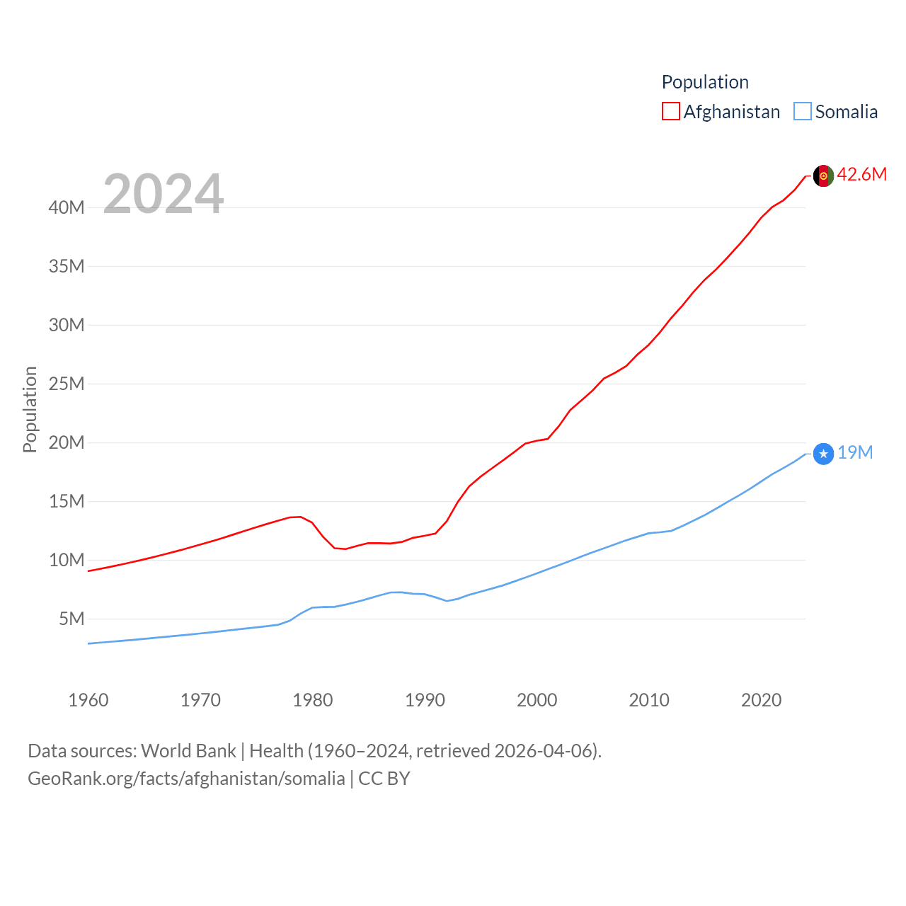 Afghanistan has a population of 42.6M (ranked 36/197), compared with 19M in Somalia (ranked 68/197). Afghanistan's land area is 251,827 sq mi versus 242,217 sq mi for Somalia (ranked 40th vs. 42nd).