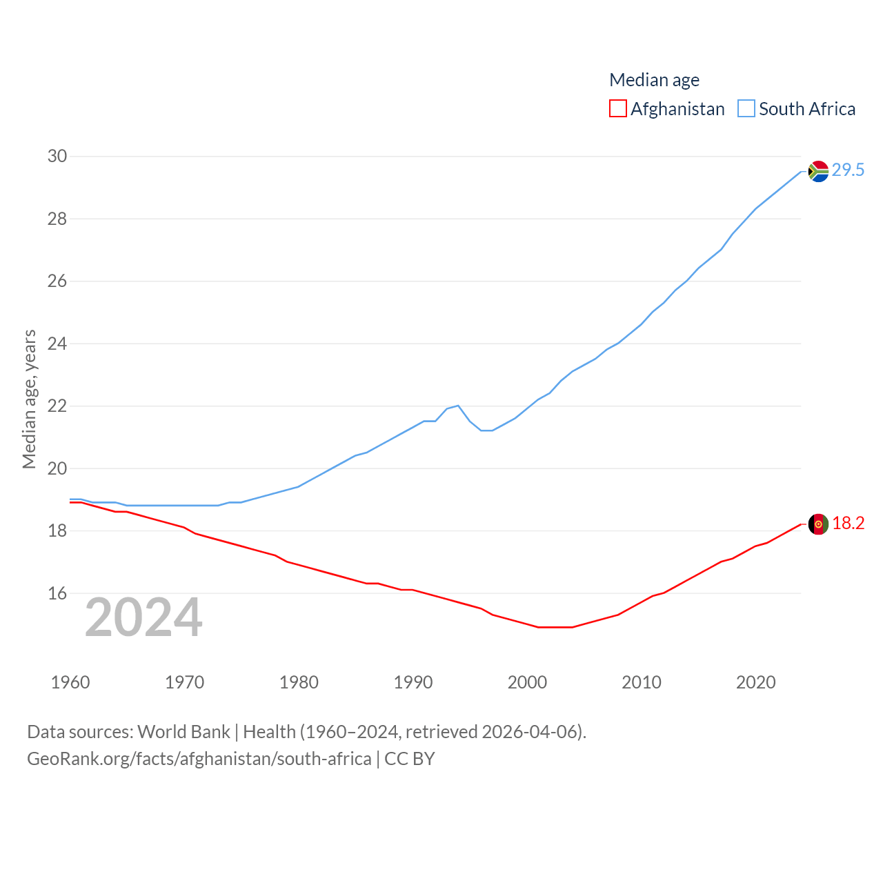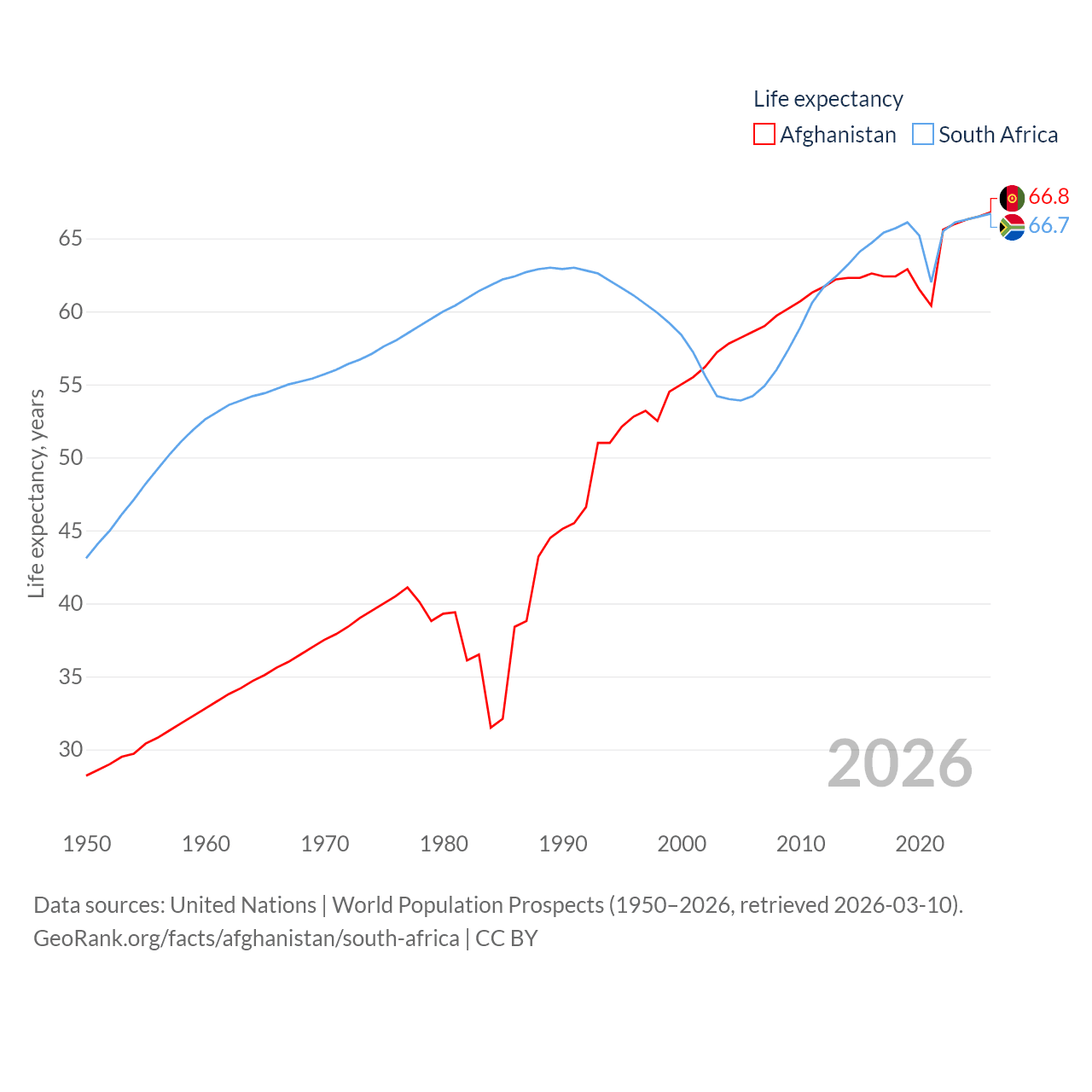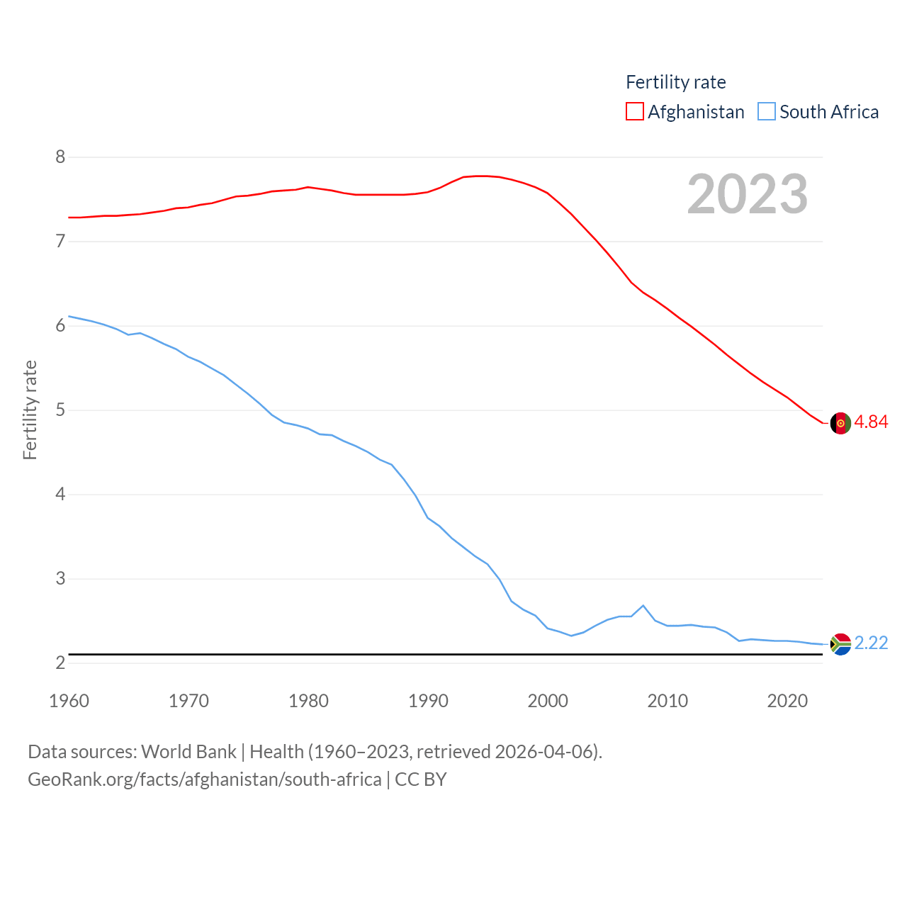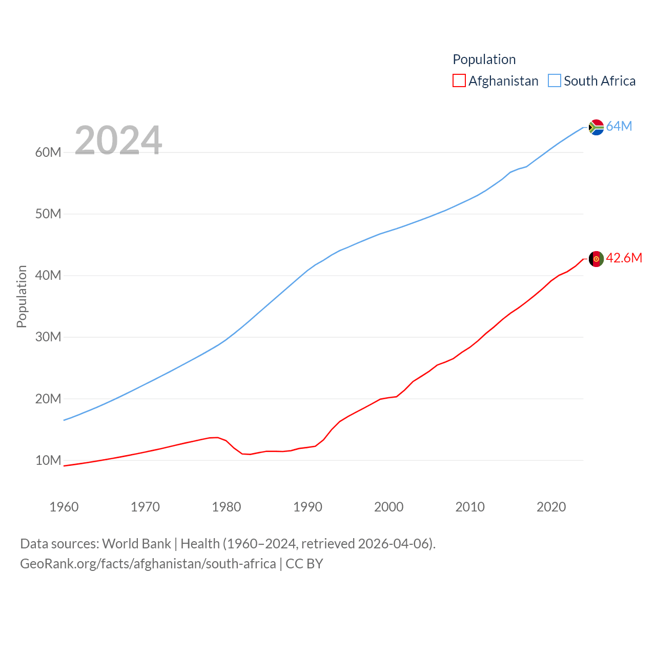 Afghanistan has a population of 42.6M (ranked 36/197), compared with 64M in South Africa (ranked 24/197). Afghanistan's land area is 251,827 sq mi versus 468,377 sq mi for South Africa (ranked 40th vs. 24th).
