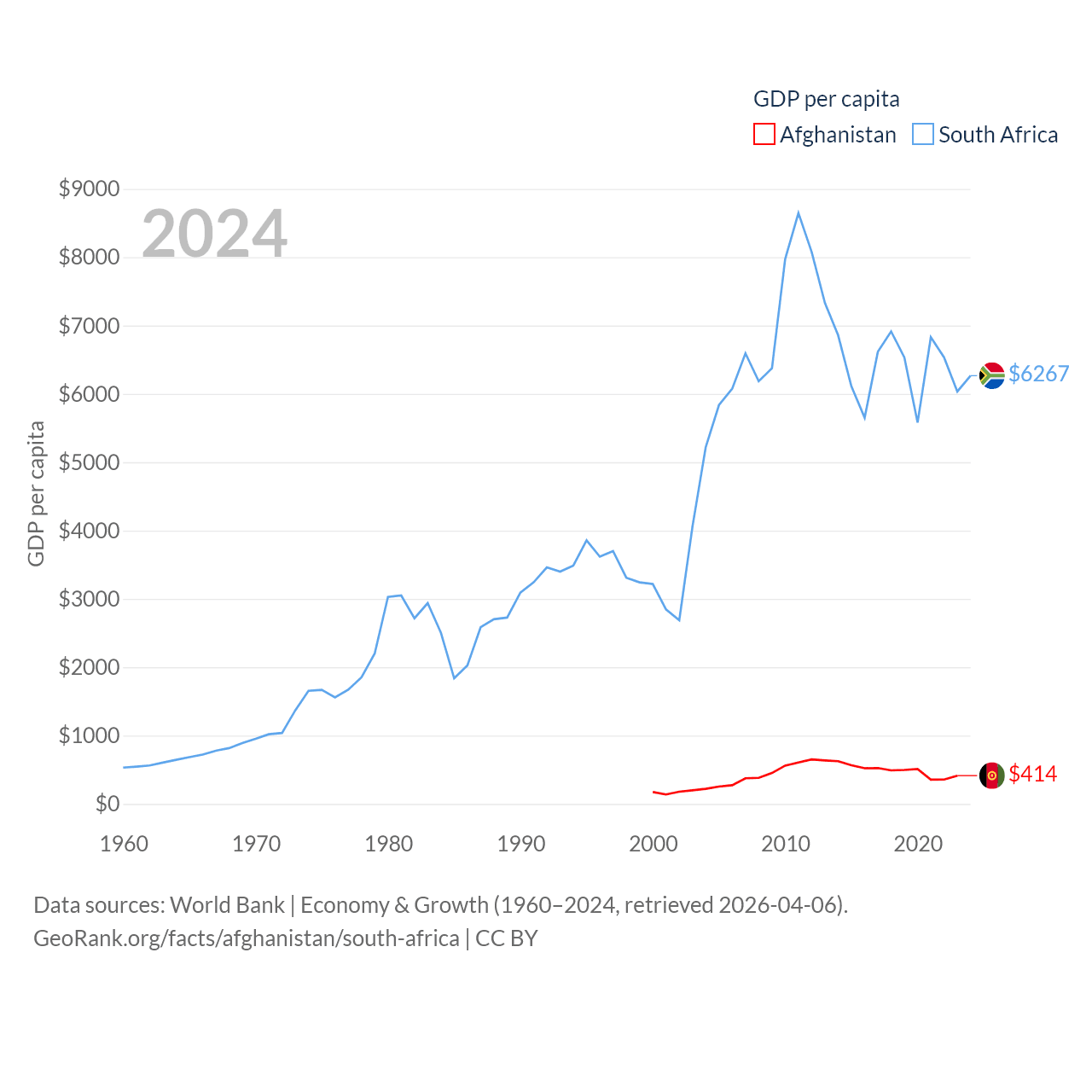 By GDP, Afghanistan ranks 137/197 ($17.2B) and South Africa ranks 40/197 ($401B). By GDP per capita, Afghanistan ranks 196/197 ($414), while South Africa ranks 111/197 ($6,267).
