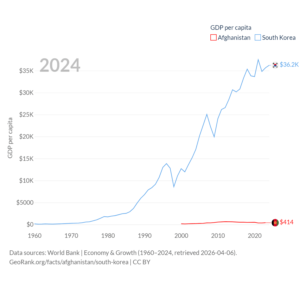 By GDP, Afghanistan ranks 137/197 ($17.2B) and South Korea ranks 12/197 ($1.88T). By GDP per capita, Afghanistan ranks 196/197 ($414), while South Korea ranks 31/197 ($36,239).