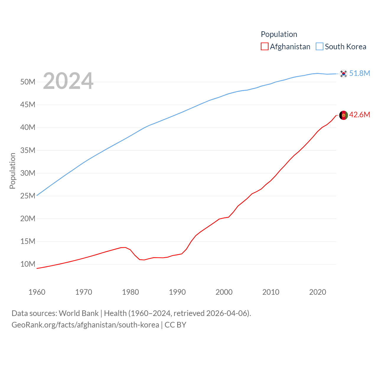 Afghanistan has a population of 42.6M (ranked 36/197), compared with 51.8M in South Korea (ranked 29/197). Afghanistan's land area is 251,827 sq mi versus 37,684 sq mi for South Korea (ranked 40th vs. 105th).