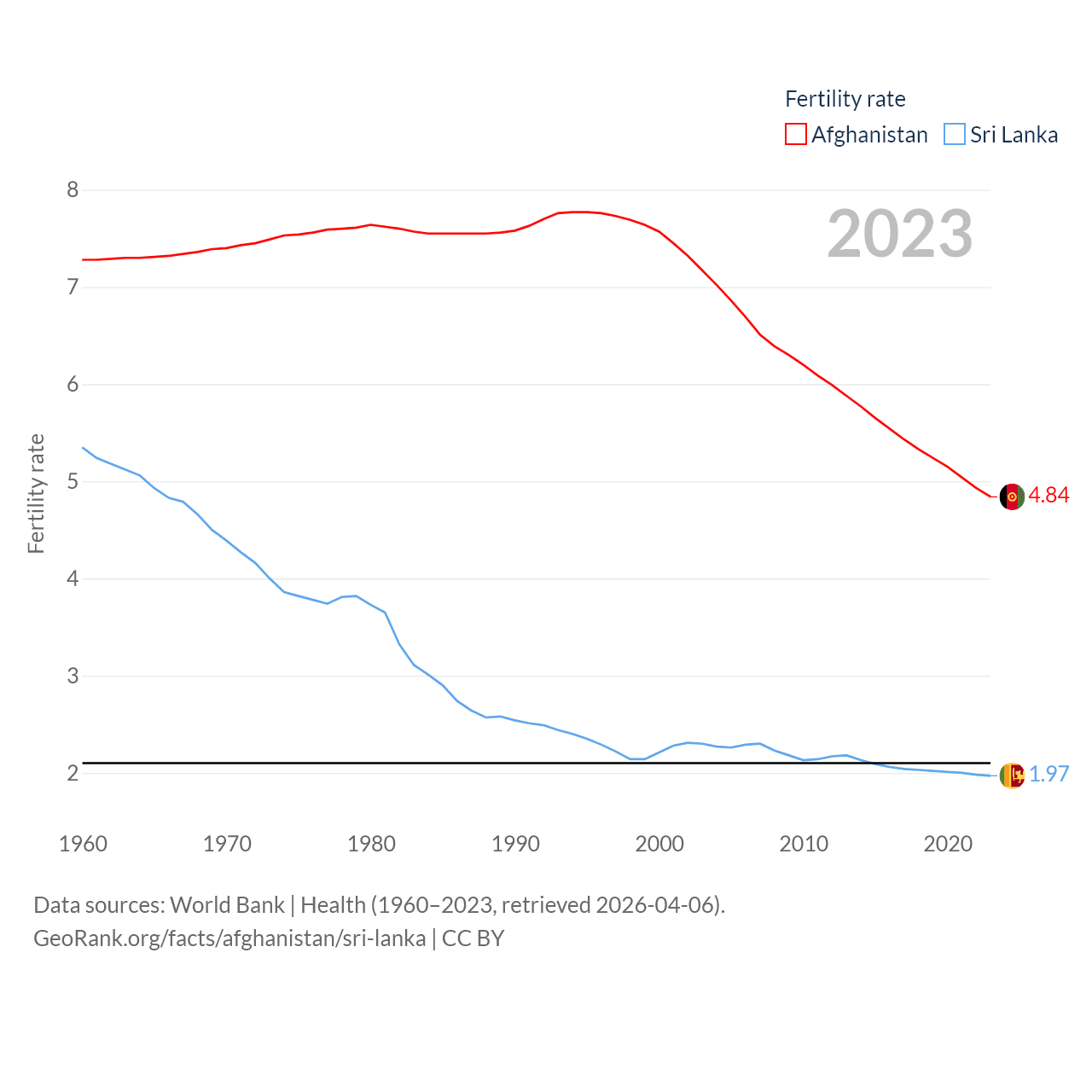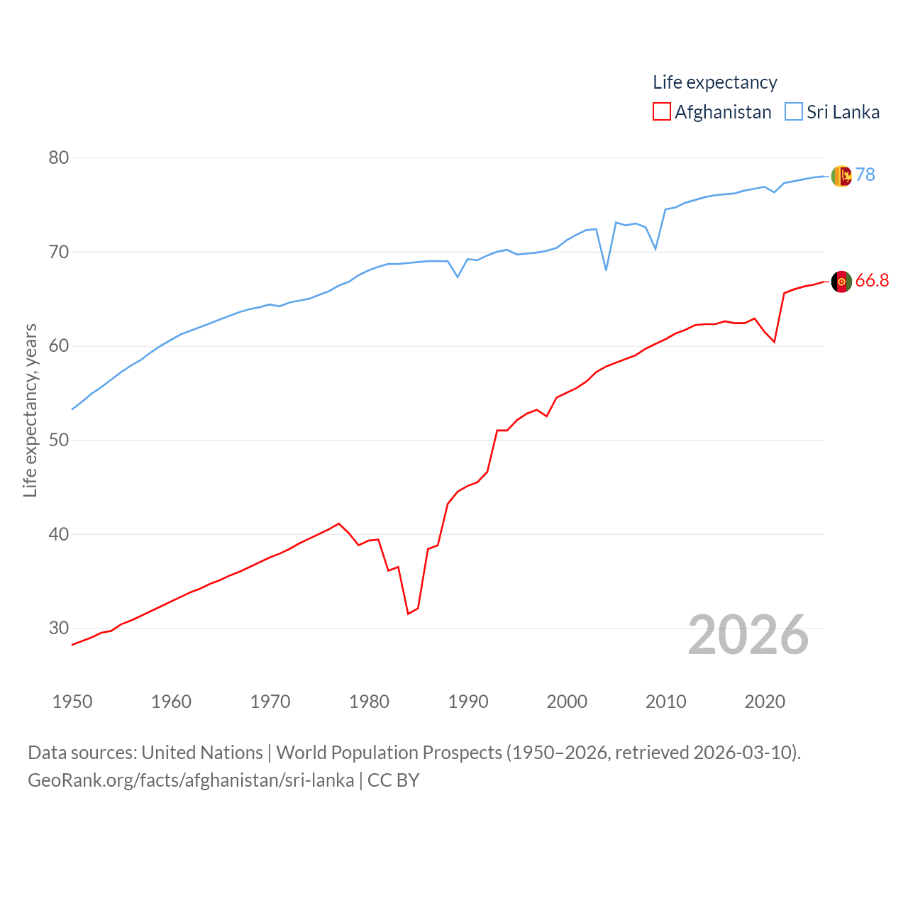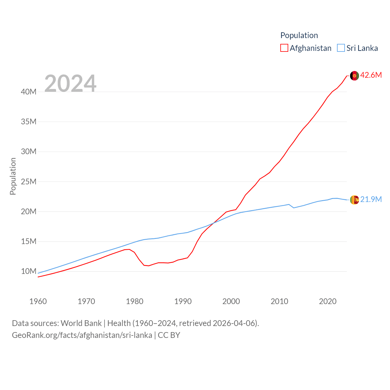 Afghanistan has a population of 42.6M (ranked 36/197), compared with 21.9M in Sri Lanka (ranked 61/197). Afghanistan's land area is 251,827 sq mi versus 23,884 sq mi for Sri Lanka (ranked 40th vs. 122nd).