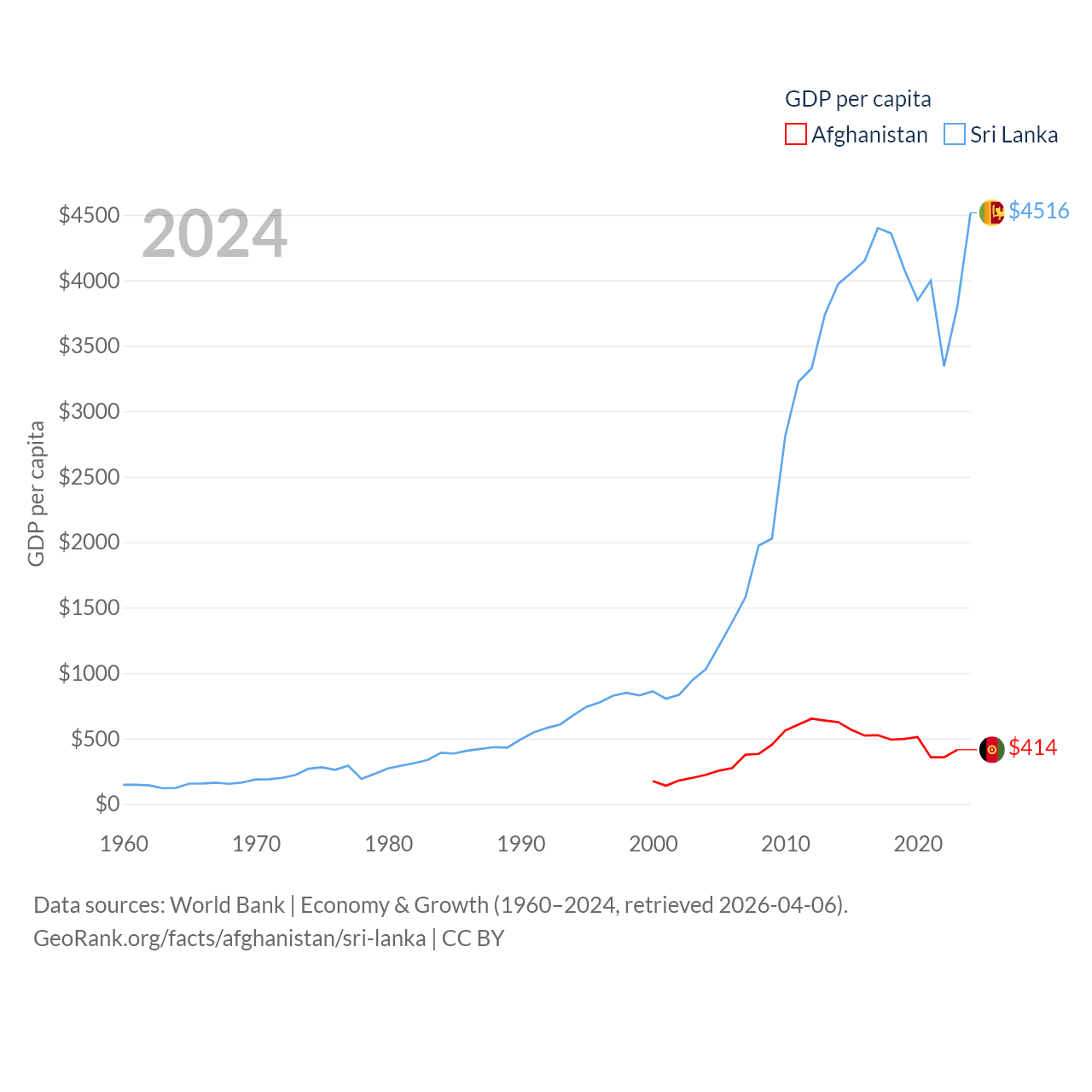 By GDP, Afghanistan ranks 137/197 ($17.2B) and Sri Lanka ranks 72/197 ($99B). By GDP per capita, Afghanistan ranks 196/197 ($414), while Sri Lanka ranks 124/197 ($4,516).