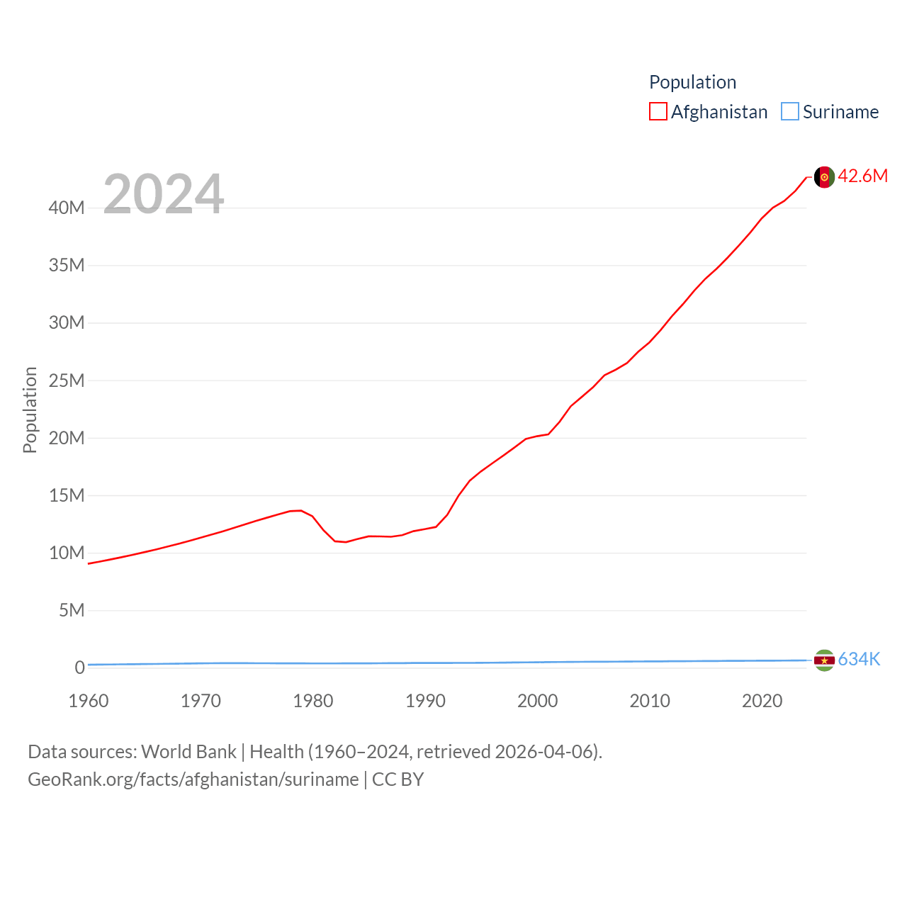 Afghanistan has a population of 42.6M (ranked 36/197), compared with 634K in Suriname (ranked 165/197). Afghanistan's land area is 251,827 sq mi versus 61,972 sq mi for Suriname (ranked 40th vs. 90th).