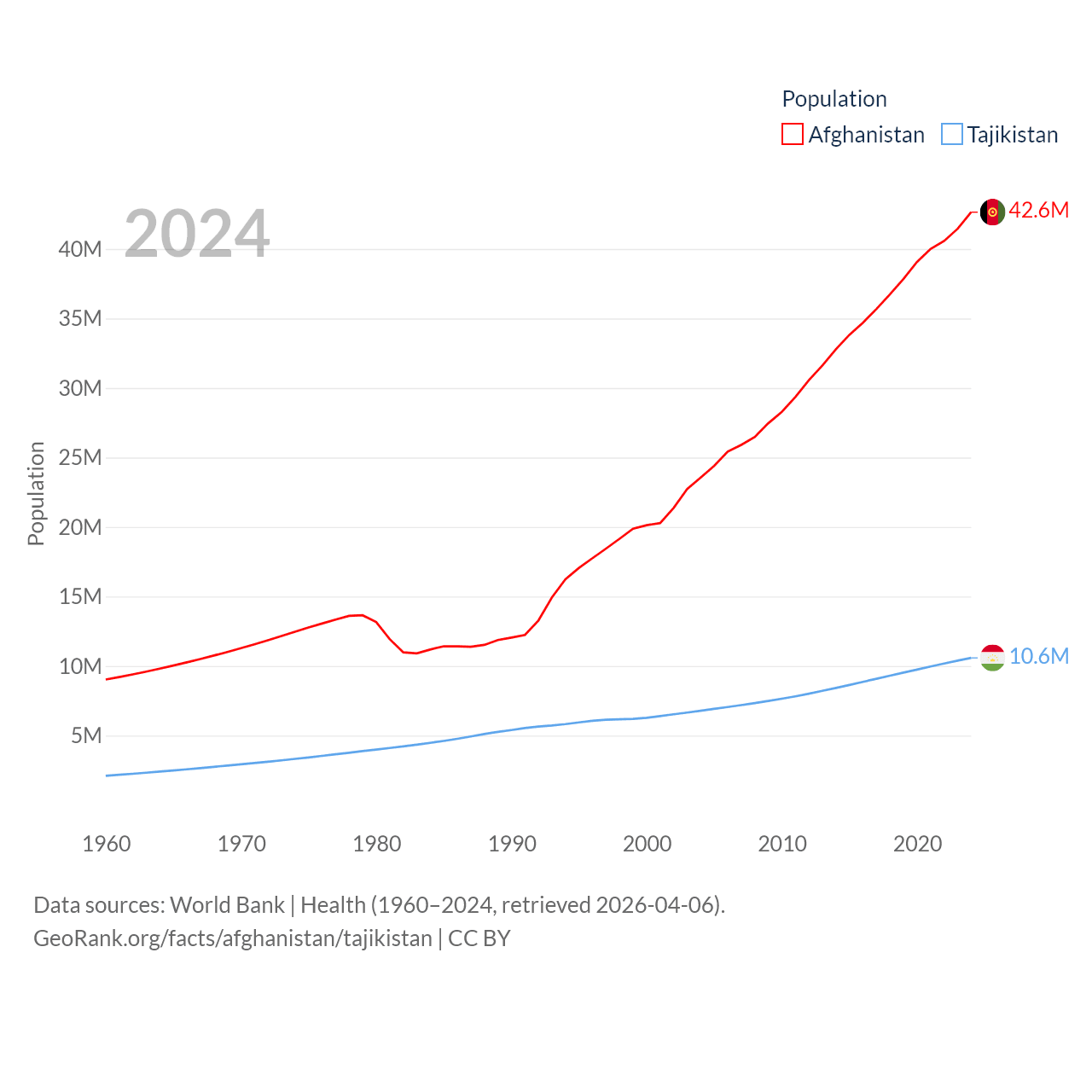 Afghanistan has a population of 42.6M (ranked 36/197), compared with 10.6M in Tajikistan (ranked 91/197). Afghanistan's land area is 251,827 sq mi versus 53,587 sq mi for Tajikistan (ranked 40th vs. 93rd).