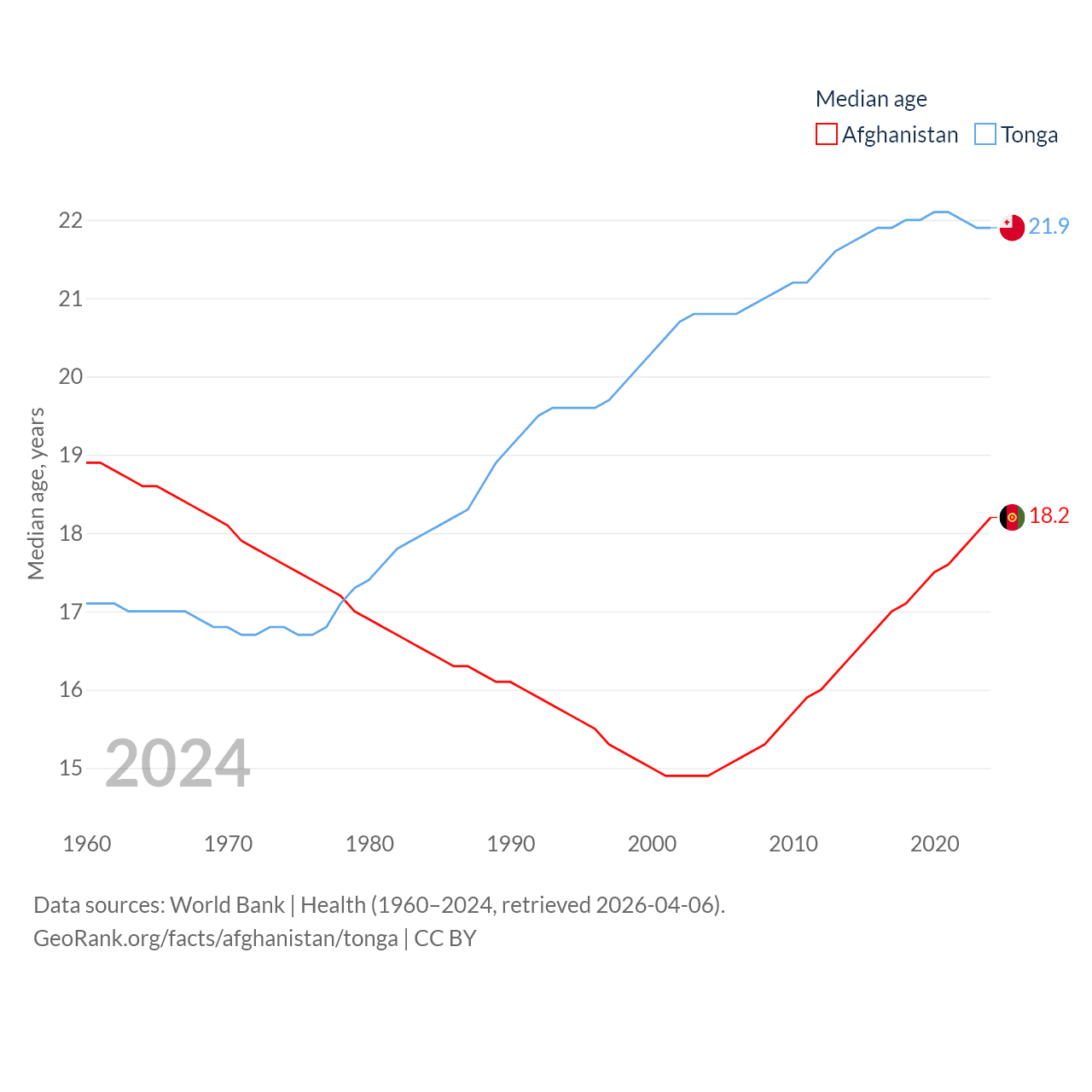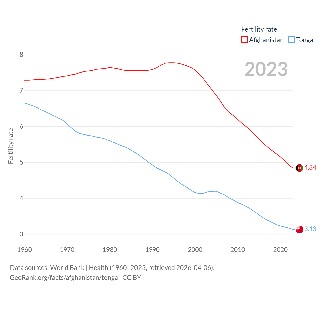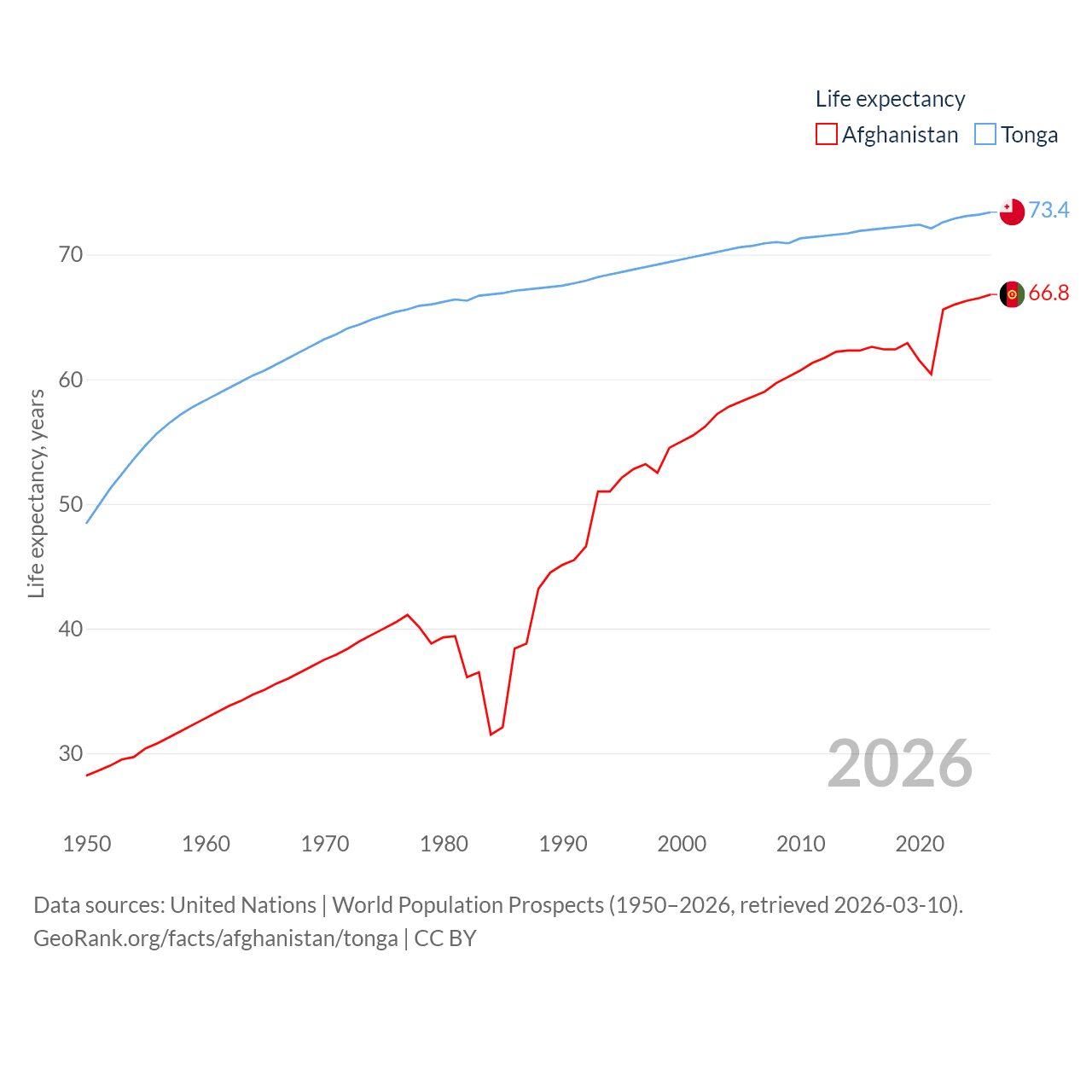 Afghanistan has a population of 42.6M (ranked 36/197), compared with 104K in Tonga (ranked 183/197). Afghanistan's land area is 251,827 sq mi versus 278 sq mi for Tonga (ranked 40th vs. 176th).