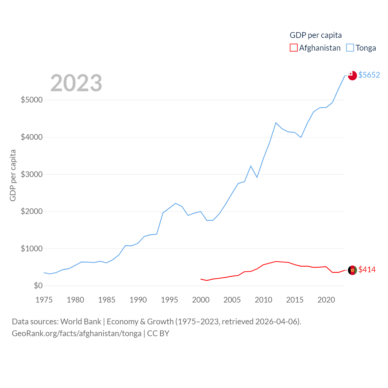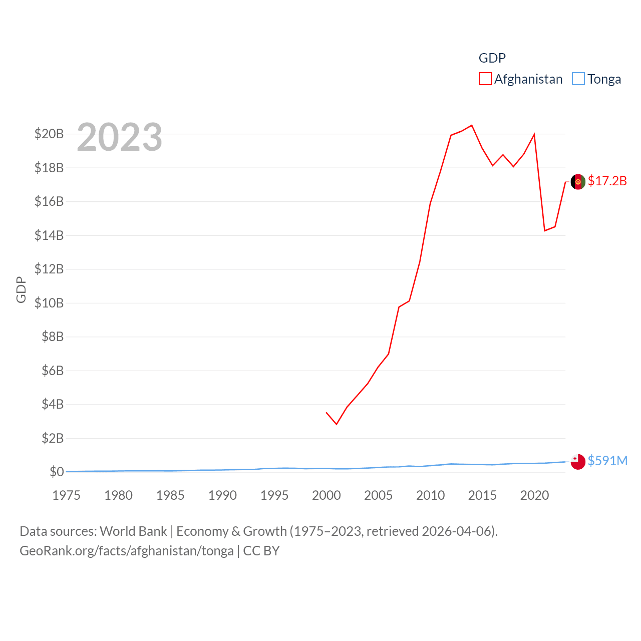By GDP, Afghanistan ranks 137/197 ($17.2B) and Tonga ranks 191/197 ($591M). By GDP per capita, Afghanistan ranks 196/197 ($414), while Tonga ranks 115/197 ($5,652).