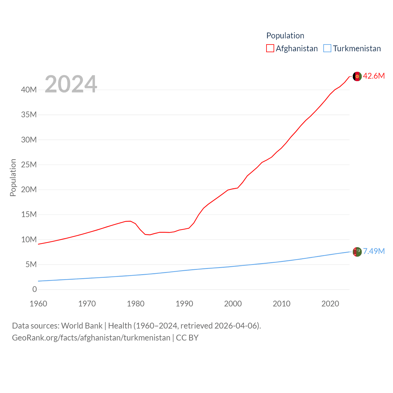 Afghanistan has a population of 42.6M (ranked 36/197), compared with 7.49M in Turkmenistan (ranked 104/197). Afghanistan's land area is 251,827 sq mi versus 181,441 sq mi for Turkmenistan (ranked 40th vs. 53rd).