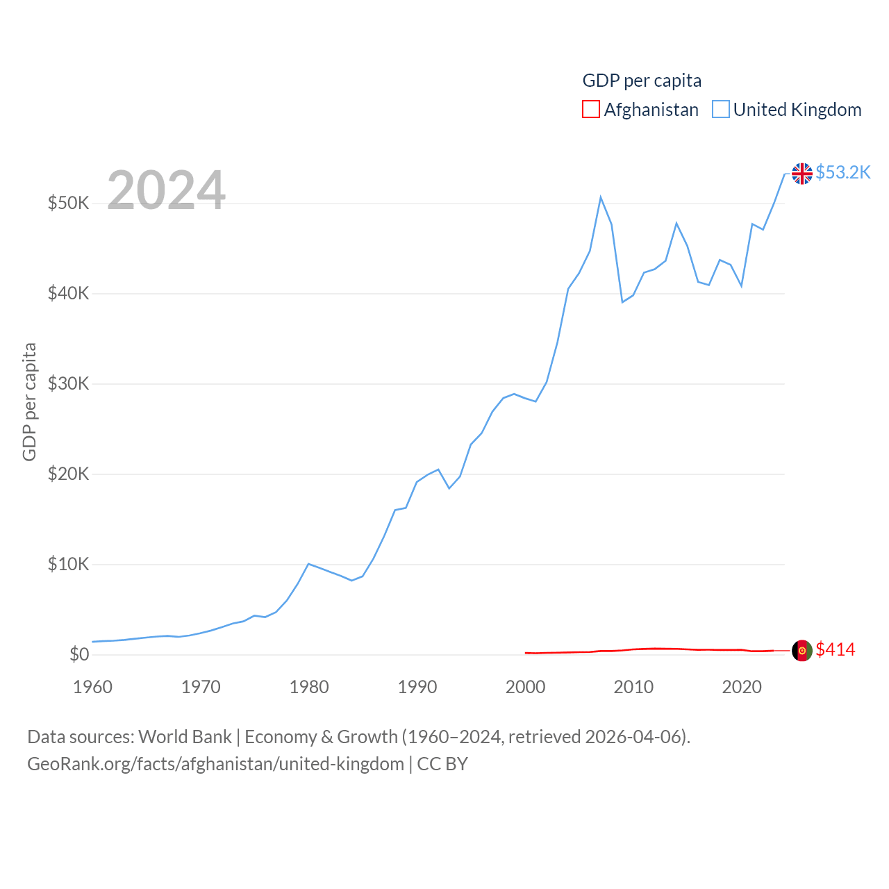 By GDP, Afghanistan ranks 137/197 ($17.2B) and The United Kingdom ranks 6/197 ($3.69T). By GDP per capita, Afghanistan ranks 196/197 ($414), while The United Kingdom ranks 22/197 ($53,246).