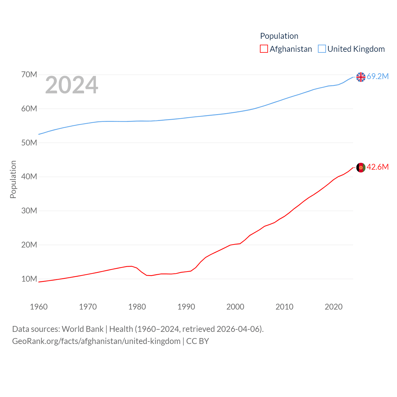 Afghanistan has a population of 42.6M (ranked 36/197), compared with 69.2M in The United Kingdom (ranked 21/197). Afghanistan's land area is 251,827 sq mi versus 93,410 sq mi for The United Kingdom (ranked 40th vs. 78th).