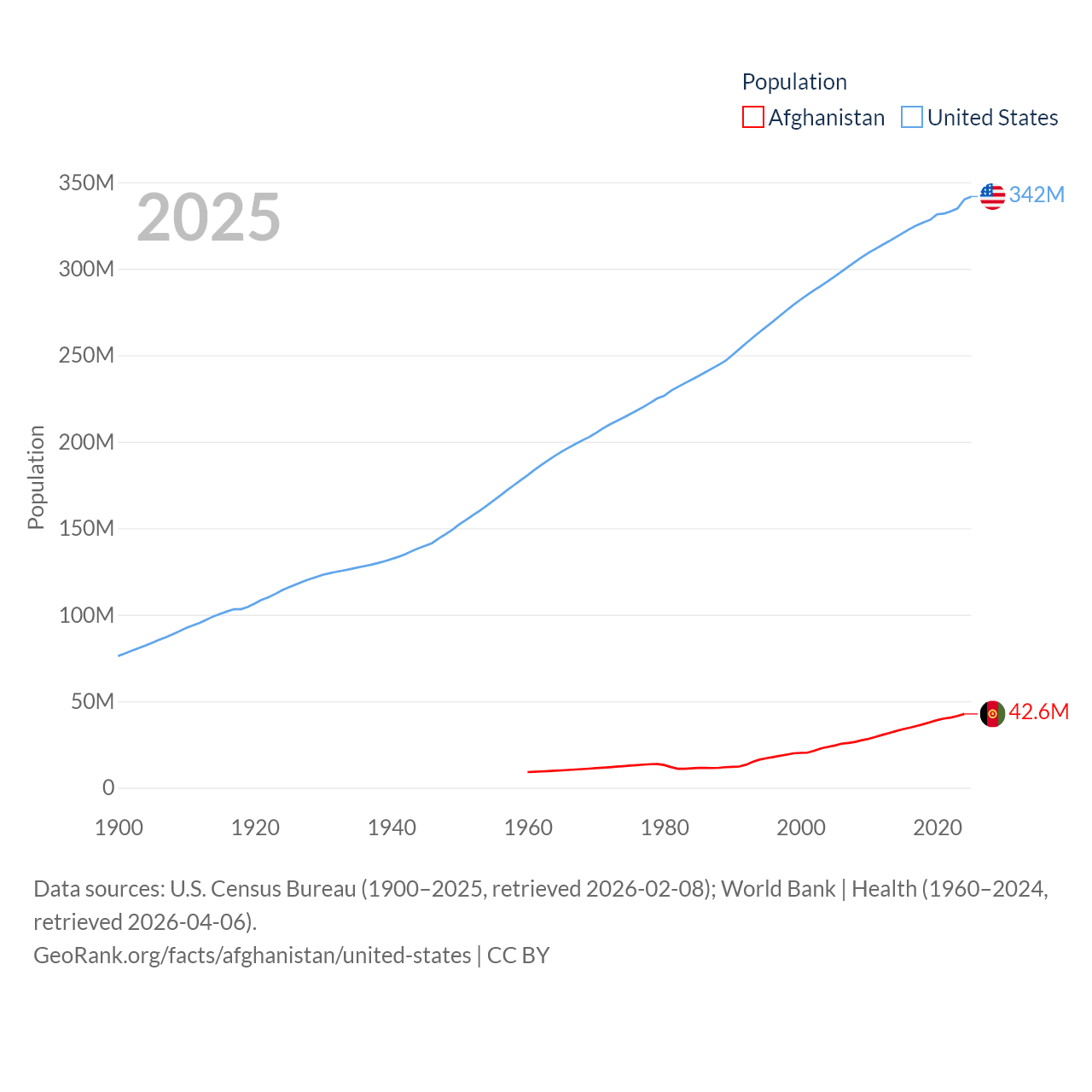 Afghanistan has a population of 42.6M (ranked 36/197), compared with 342M in The United States (ranked 3/197). Afghanistan's land area is 251,827 sq mi versus 3,531,839 sq mi for The United States (ranked 40th vs. 3rd).