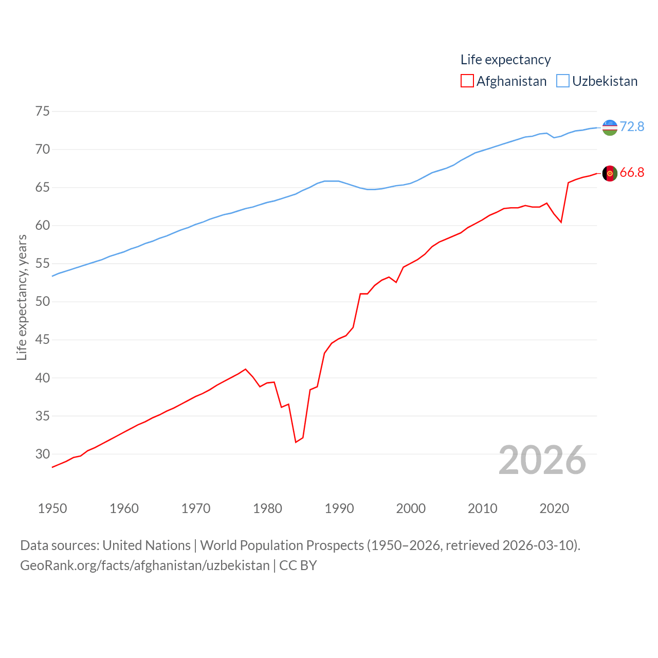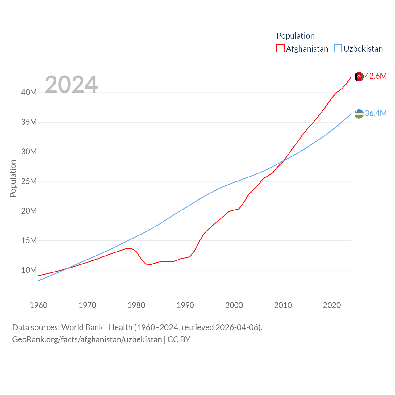 Afghanistan has a population of 42.6M (ranked 36/197), compared with 36.4M in Uzbekistan (ranked 43/197). Afghanistan's land area is 251,827 sq mi versus 170,136 sq mi for Uzbekistan (ranked 40th vs. 56th).