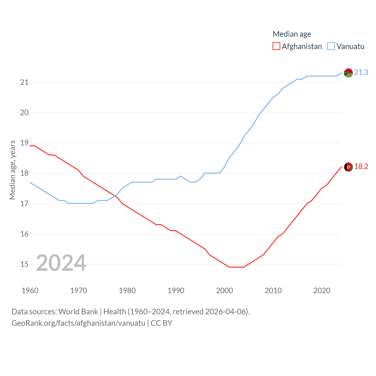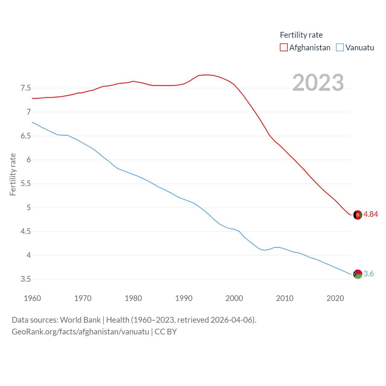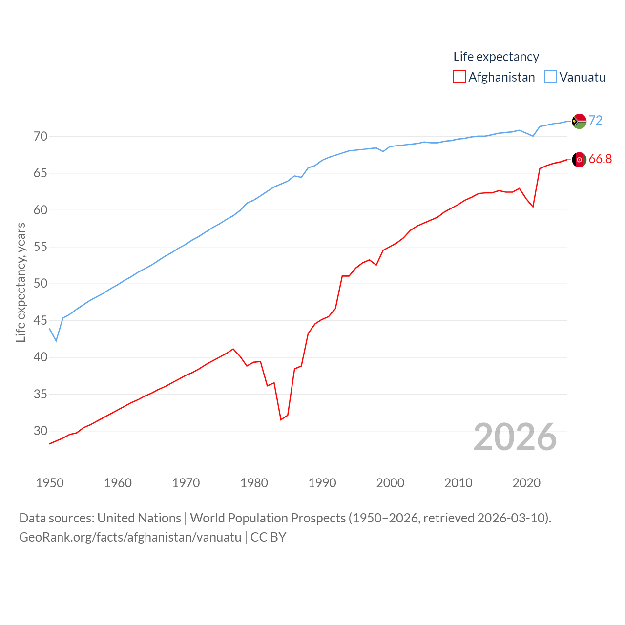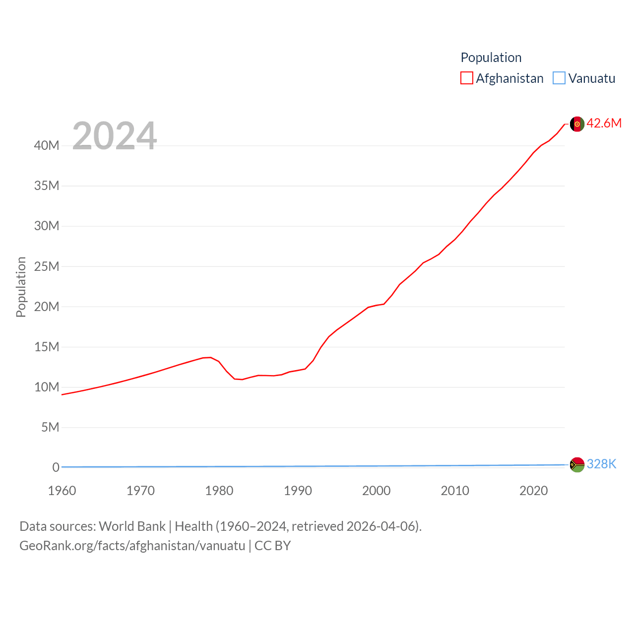 Afghanistan has a population of 42.6M (ranked 36/197), compared with 328K in Vanuatu (ranked 174/197). Afghanistan's land area is 251,827 sq mi versus 4,707 sq mi for Vanuatu (ranked 40th vs. 157th).