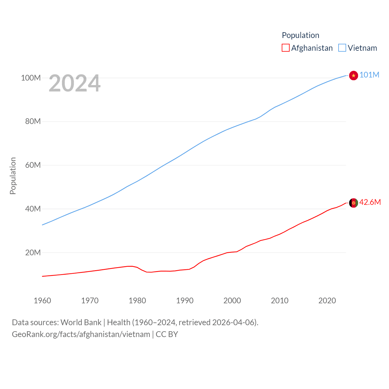 Afghanistan has a population of 42.6M (ranked 36/197), compared with 101M in Vietnam (ranked 16/197). Afghanistan's land area is 251,827 sq mi versus 121,016 sq mi for Vietnam (ranked 40th vs. 67th).