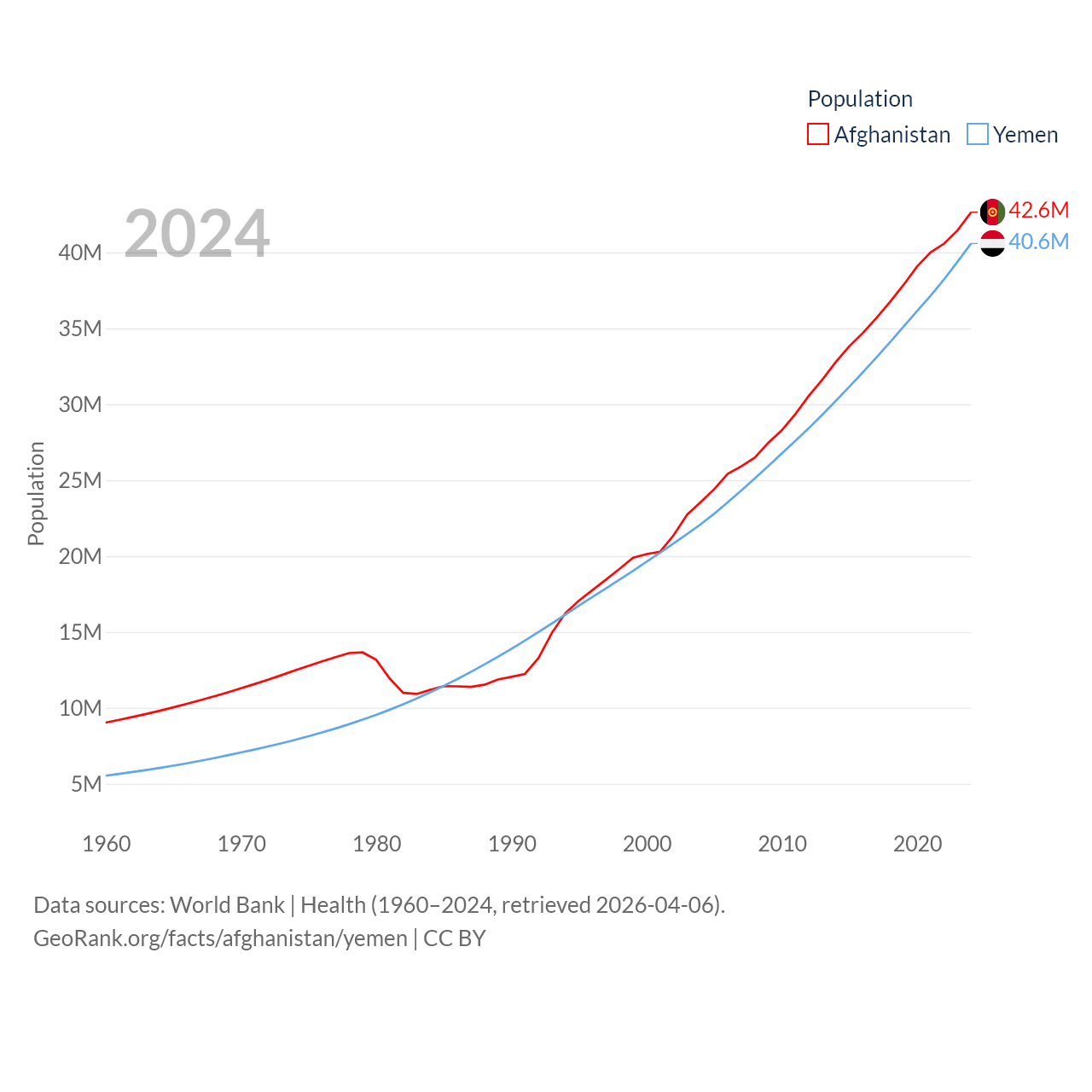 Afghanistan has a population of 42.6M (ranked 36/197), compared with 40.6M in Yemen (ranked 38/197). Afghanistan's land area is 251,827 sq mi versus 203,850 sq mi for Yemen (ranked 40th vs. 49th).