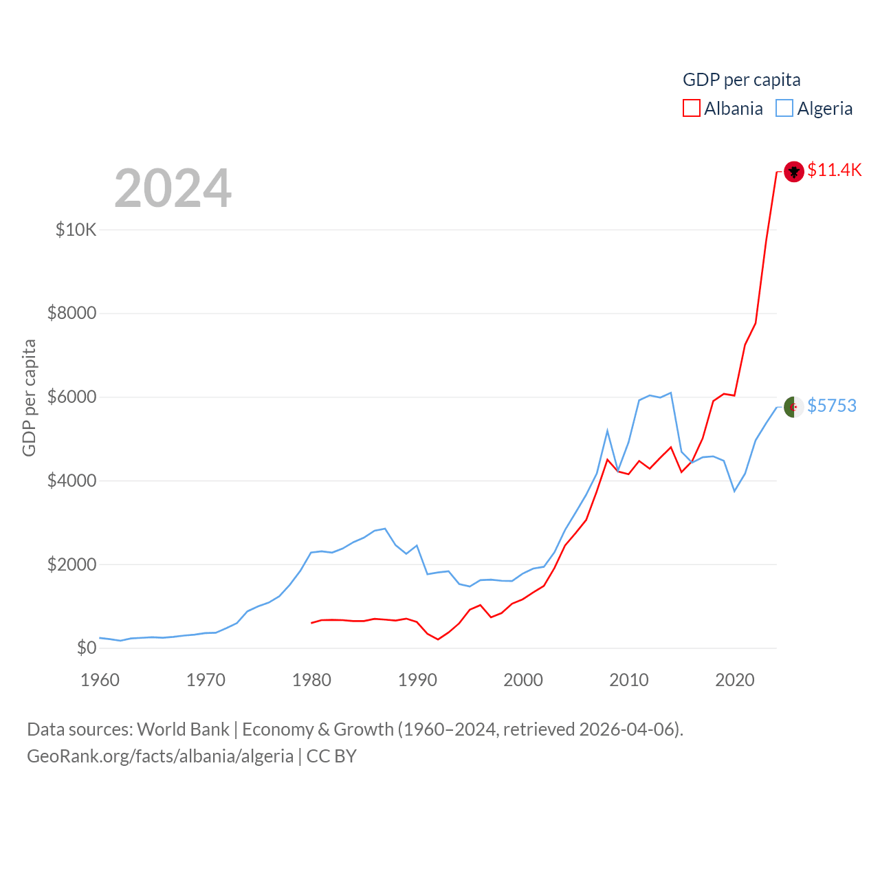 By GDP, Albania ranks 112/197 ($27B) and Algeria ranks 51/197 ($269B). By GDP per capita, Albania ranks 82/197 ($11,378), while Algeria ranks 114/197 ($5,753).