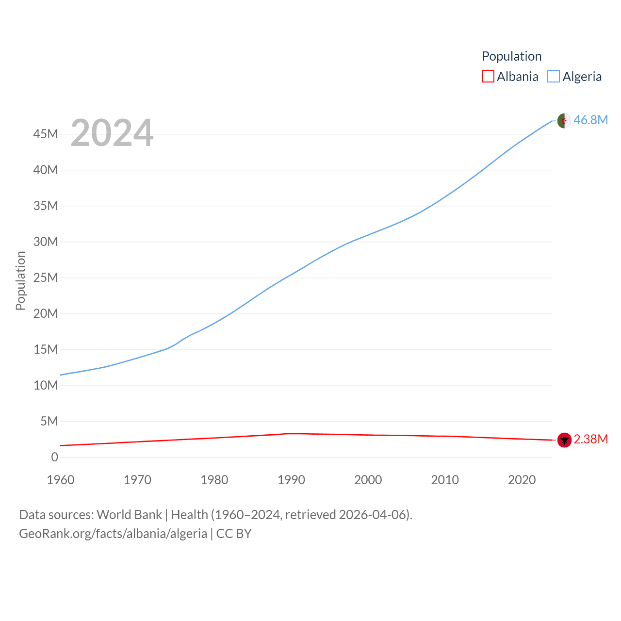 Albania has a population of 2.38M (ranked 144/197), compared with 46.8M in Algeria (ranked 33/197). Albania's land area is 10,579 sq mi versus 919,595 sq mi for Algeria (ranked 143rd vs. 10th).