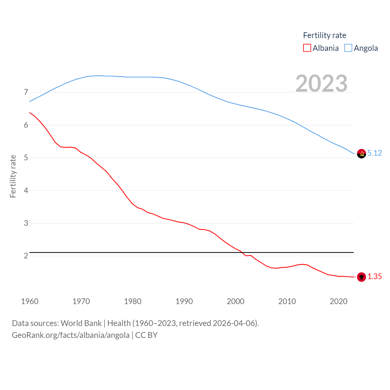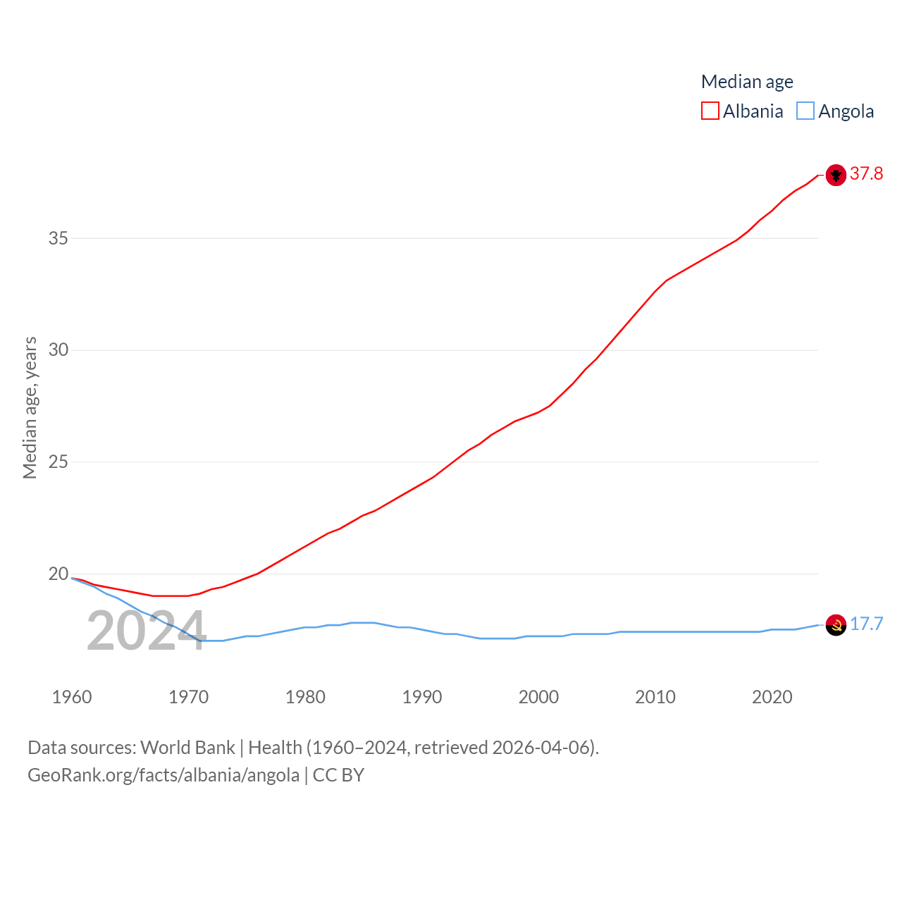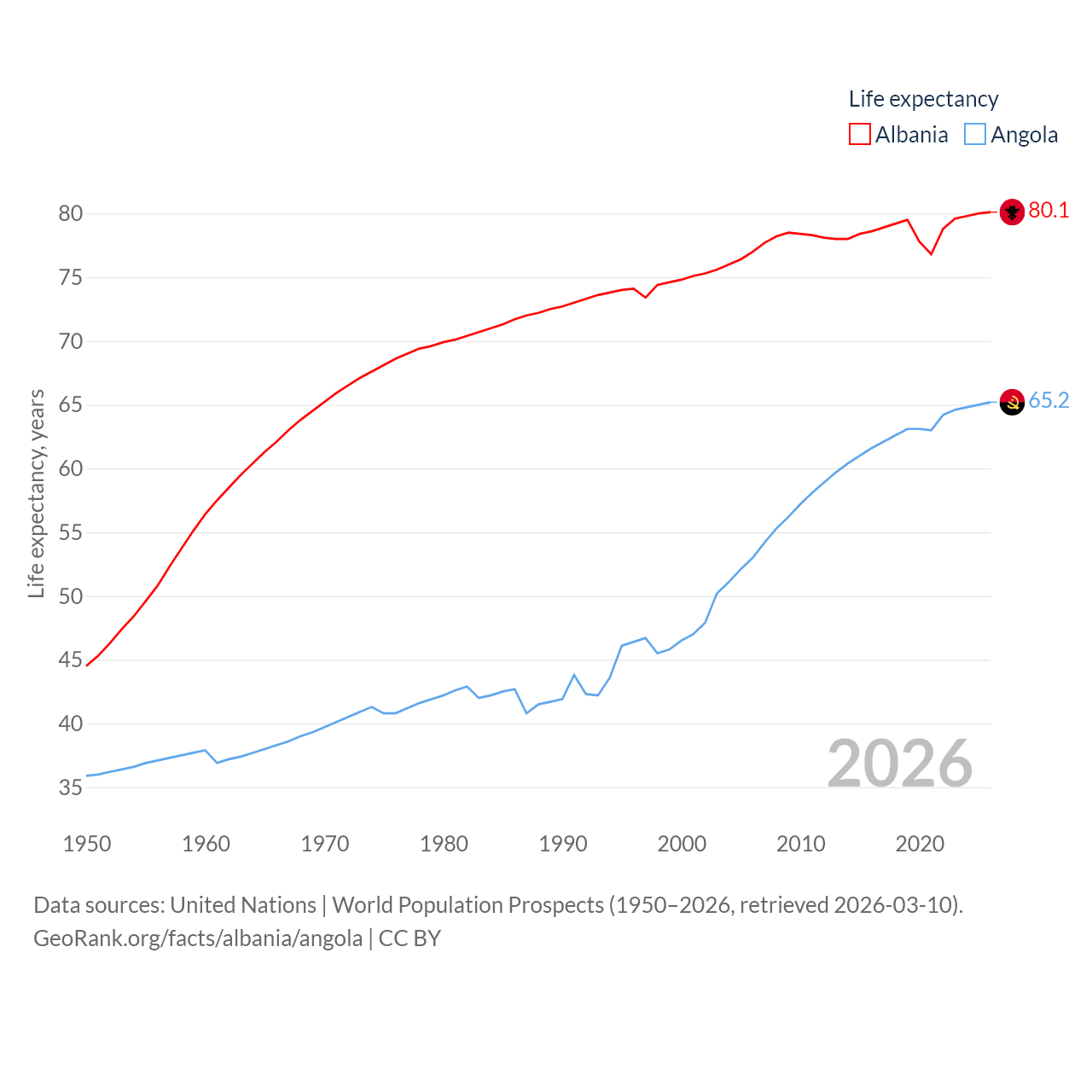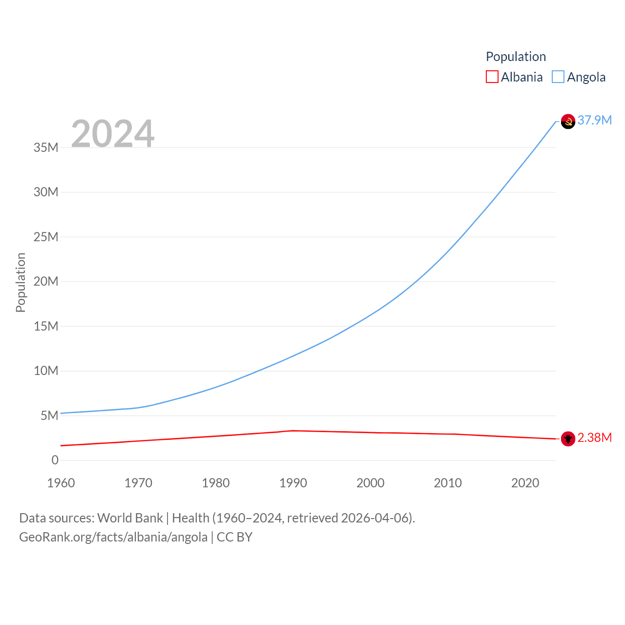 Albania has a population of 2.38M (ranked 144/197), compared with 37.9M in Angola (ranked 40/197). Albania's land area is 10,579 sq mi versus 481,354 sq mi for Angola (ranked 143rd vs. 22nd).