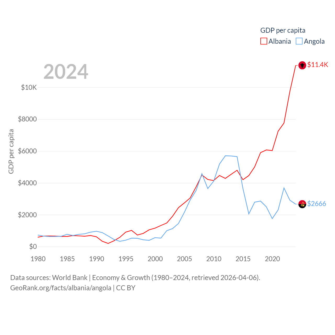 By GDP, Albania ranks 112/197 ($27B) and Angola ranks 71/197 ($101B). By GDP per capita, Albania ranks 82/197 ($11,378), while Angola ranks 144/197 ($2,666).