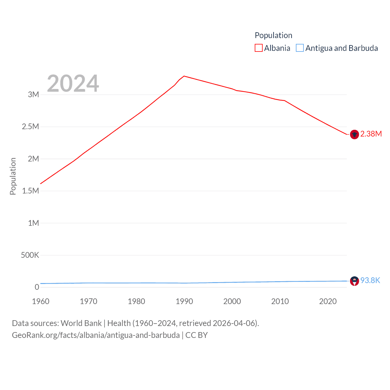 Albania has a population of 2.38M (ranked 144/197), compared with 93.8K in Antigua and Barbuda (ranked 185/197). Albania's land area is 10,579 sq mi versus 169.9 sq mi for Antigua and Barbuda (ranked 143rd vs. 183rd).