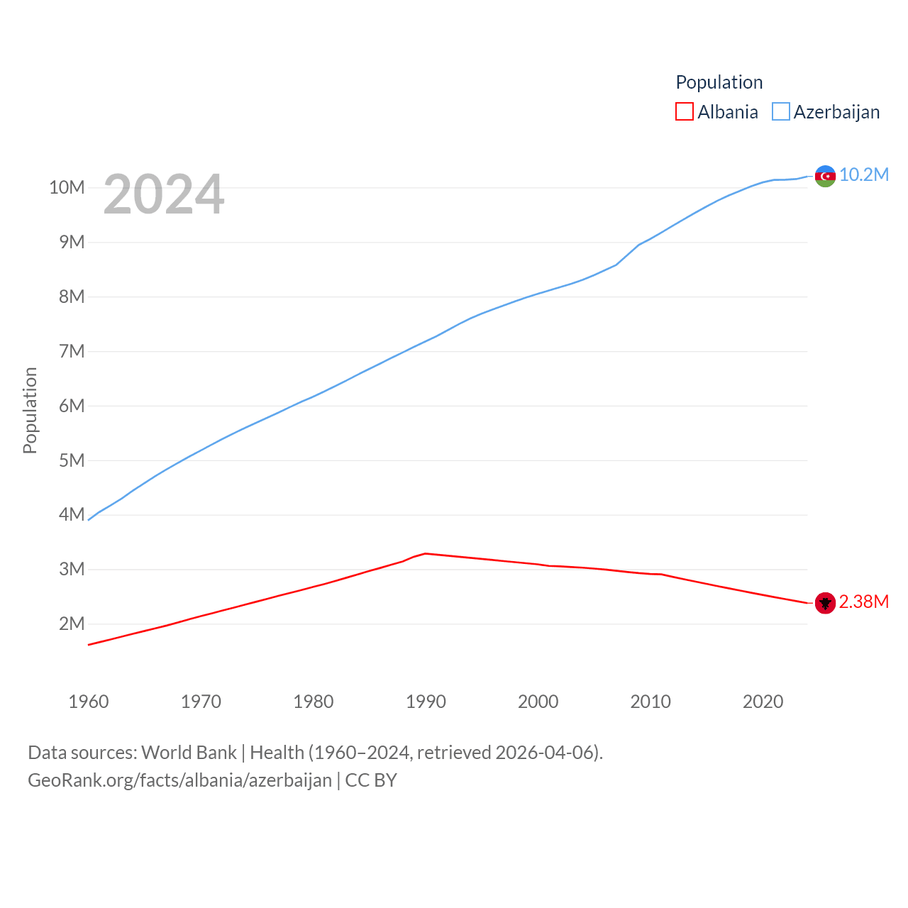 Albania has a population of 2.38M (ranked 144/197), compared with 10.2M in Azerbaijan (ranked 95/197). Albania's land area is 10,579 sq mi versus 31,911 sq mi for Azerbaijan (ranked 143rd vs. 112th).