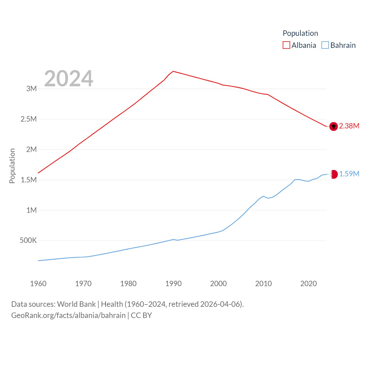 Albania has a population of 2.38M (ranked 144/197), compared with 1.59M in Bahrain (ranked 151/197). Albania's land area is 10,579 sq mi versus 309 sq mi for Bahrain (ranked 143rd vs. 174th).