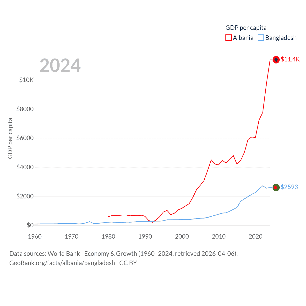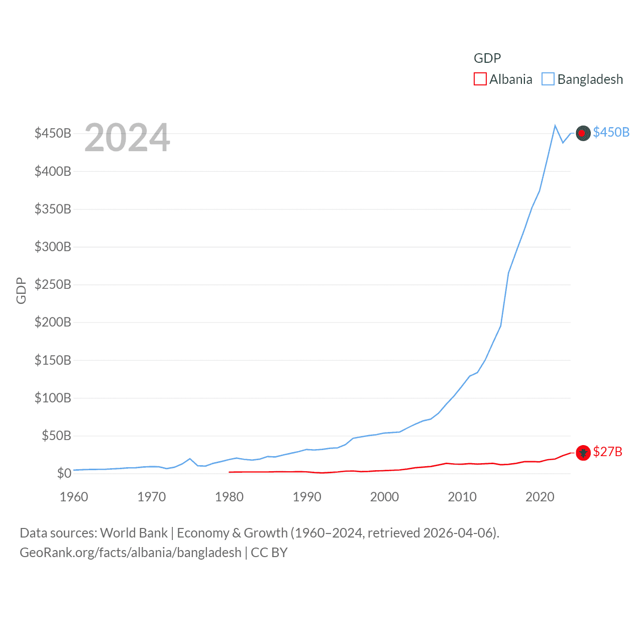 By GDP, Albania ranks 112/197 ($27B) and Bangladesh ranks 36/197 ($450B). By GDP per capita, Albania ranks 82/197 ($11,378), while Bangladesh ranks 146/197 ($2,593).