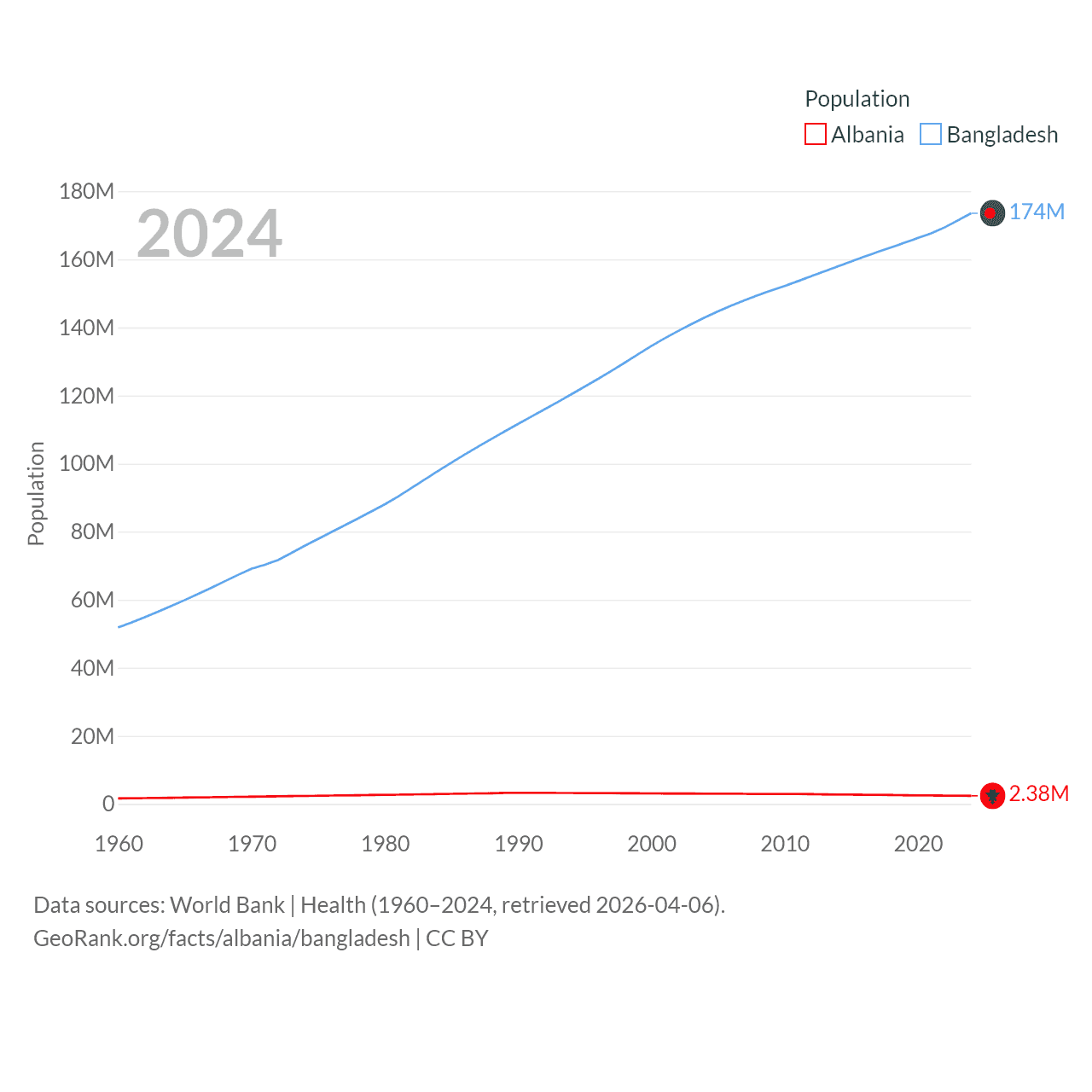 Albania has a population of 2.38M (ranked 144/197), compared with 174M in Bangladesh (ranked 8/197). Albania's land area is 10,579 sq mi versus 50,186 sq mi for Bangladesh (ranked 143rd vs. 94th).