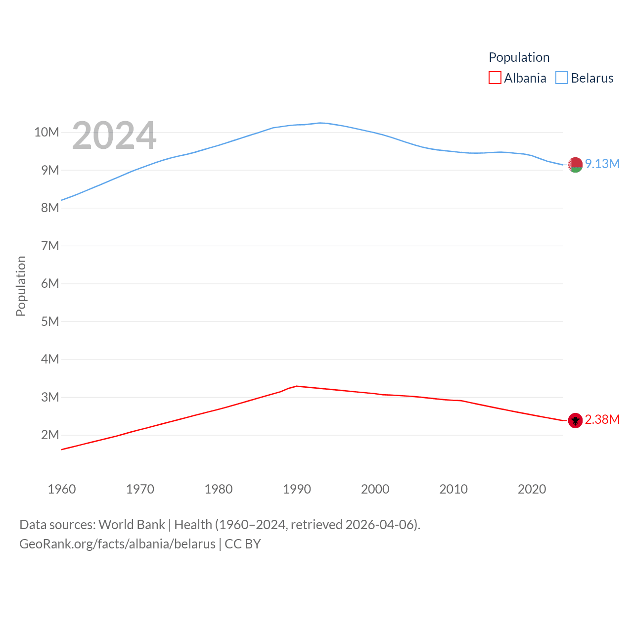 Albania has a population of 2.38M (ranked 144/197), compared with 9.13M in Belarus (ranked 100/197). Albania's land area is 10,579 sq mi versus 78,372 sq mi for Belarus (ranked 143rd vs. 83rd).